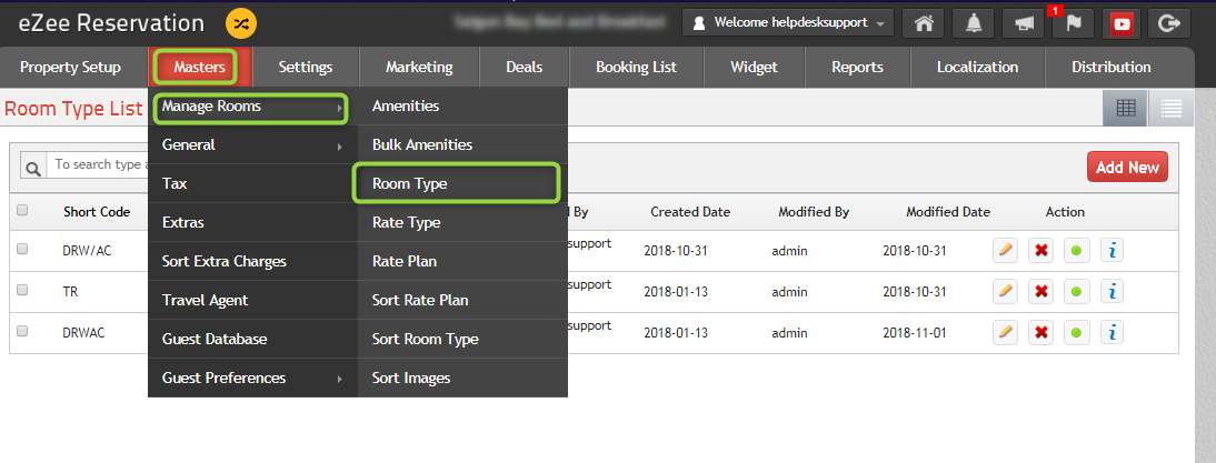 Go to Masters > Manage Rooms > Room Type.