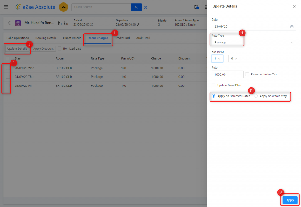 - Also check if you want to appply the rate type changes for selected dates or whole stay