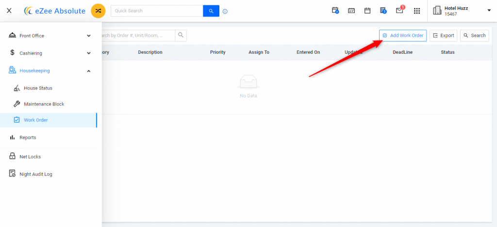 In eZee Absolute, creating a Work Order List is essential for managing maintenance tasks reported by housekeeping or guests, such as HVAC issues, faulty equipment, electrical problems, or broken furniture. Here's how you can create and manage work orders: