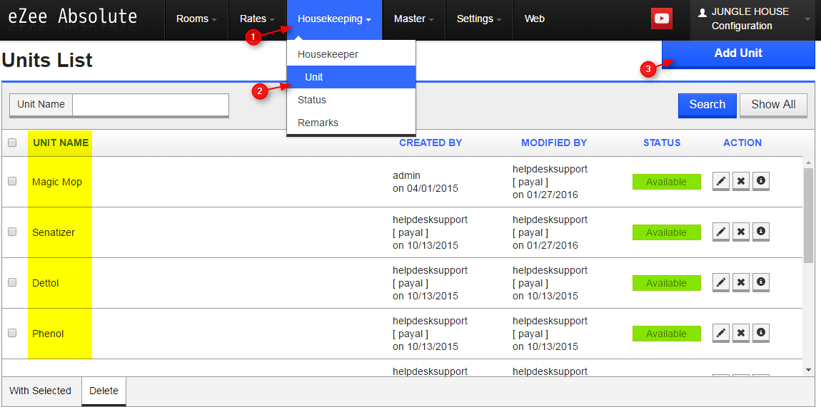 Log in to eZee Absolute Configuration > Housekeeping > Unit >