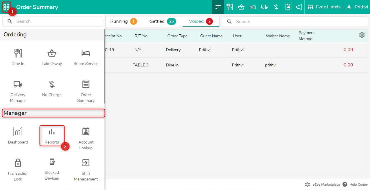 How to void a settle receipt/order and get void order report in eZee Optimus?