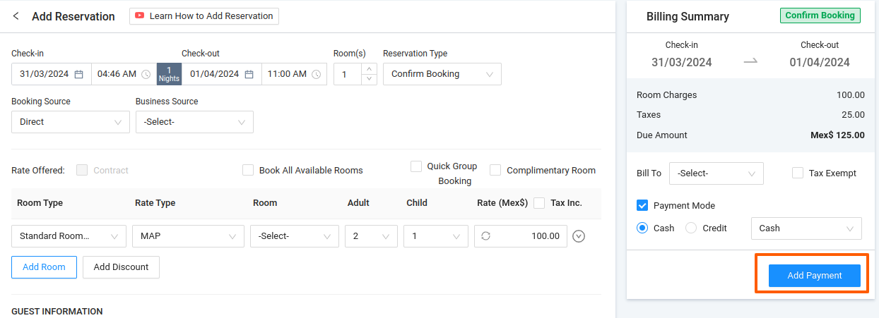 When creating a new booking manually, click the “Add Payment” button.