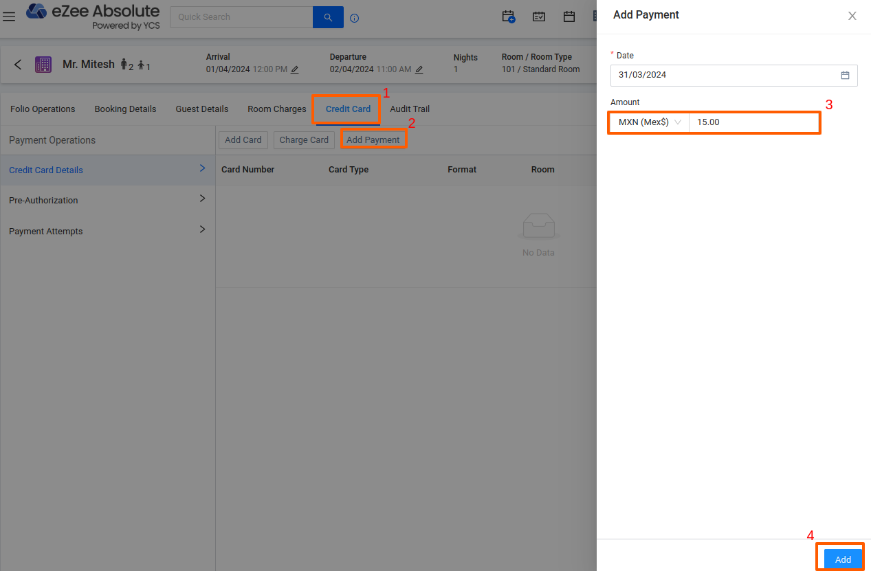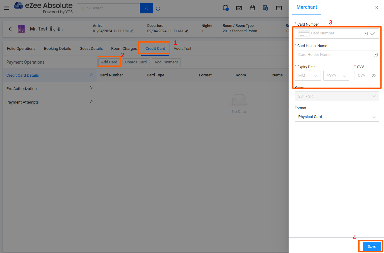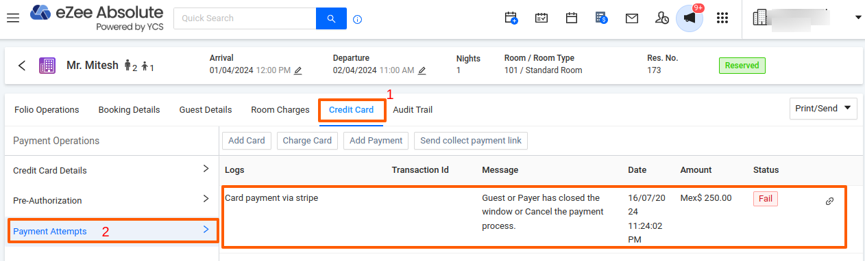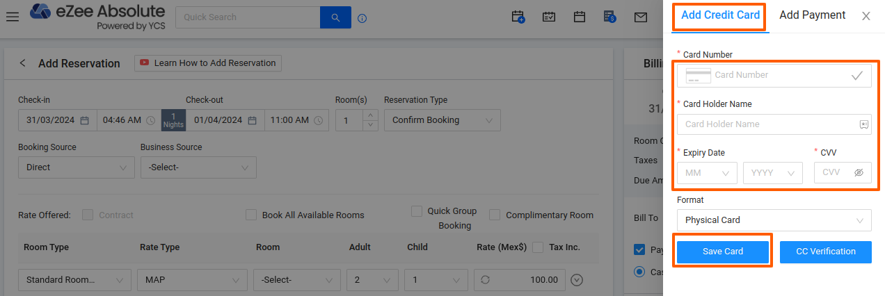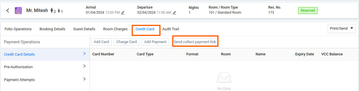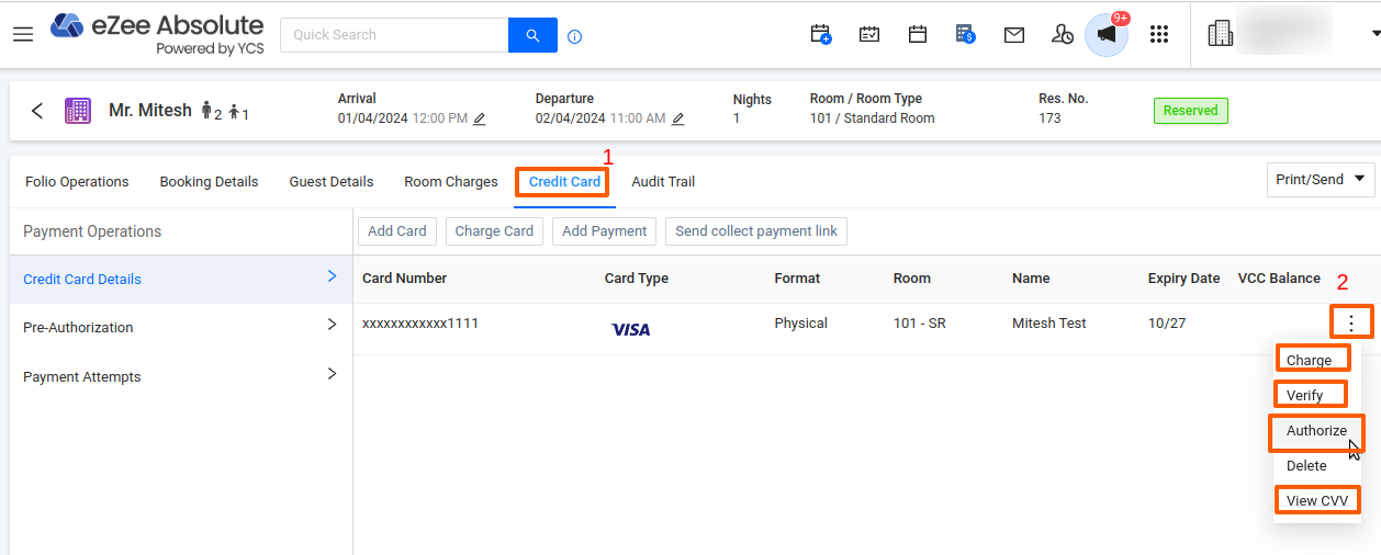 For some reservations made through Booking.com and Expedia, payments are collected by the OTA and sent to us via a Virtual Credit Card (VCC). To process these VCC payments, use the Card Charge operation within the system. This ensures accurate payment processing for both Virtual and traditional credit cards.