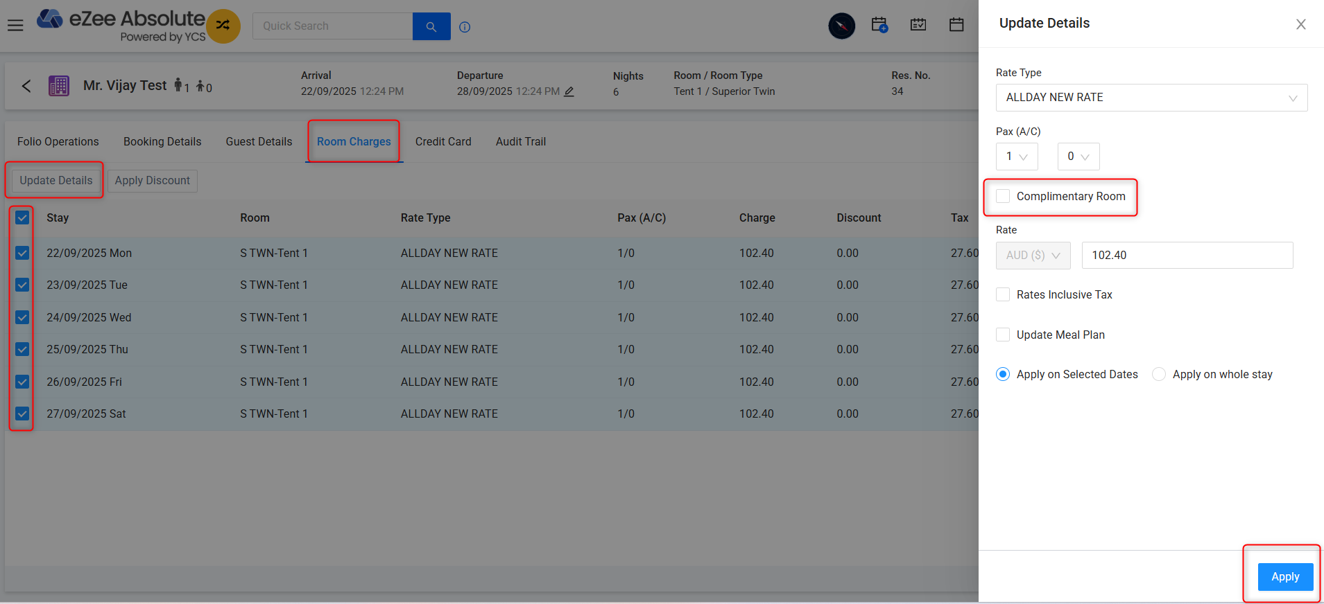 The room will now be marked as Complimentary, and all charges will be updated to ₹0.00 accordingly.