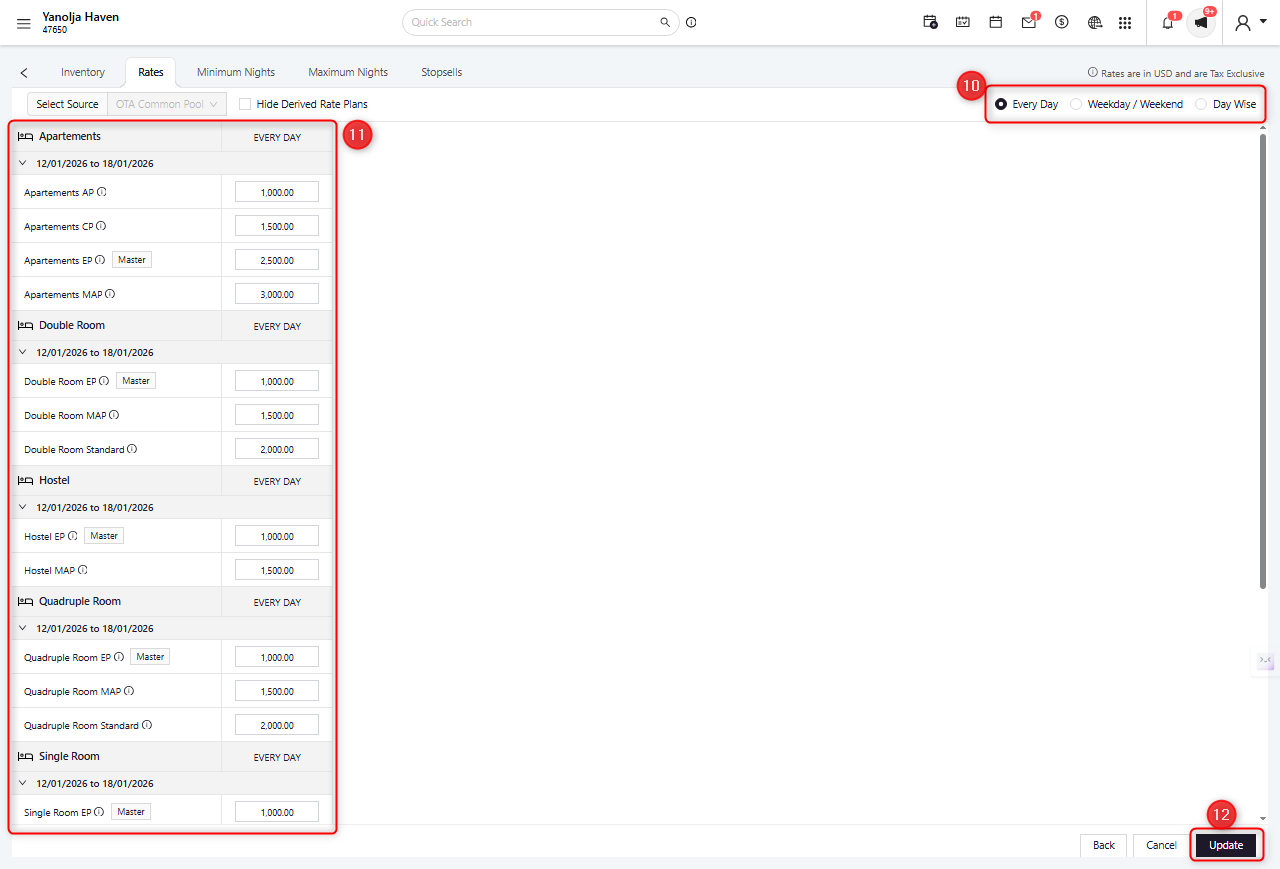 10. Select Every Day to apply updates to all days within the chosen date range/Select Weekday/Weekend to apply updates only to specific days./Select Day-wise to apply updates for specific days (e.g., Monday, Wednesday, Friday).