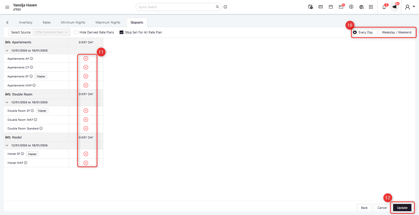 Stop Sell: Toggle the switch to apply (On) or remove (Off) a Stop Sell.
