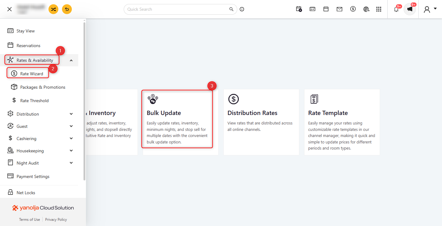 - Navigate to the 'Rate & Availability' section and select 'Rate Wizard' an in that select Bulk Update.