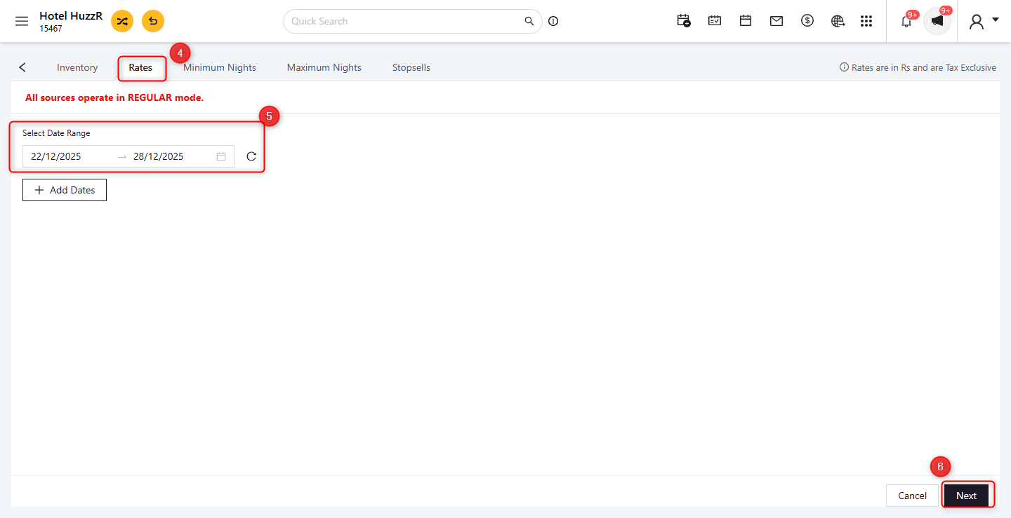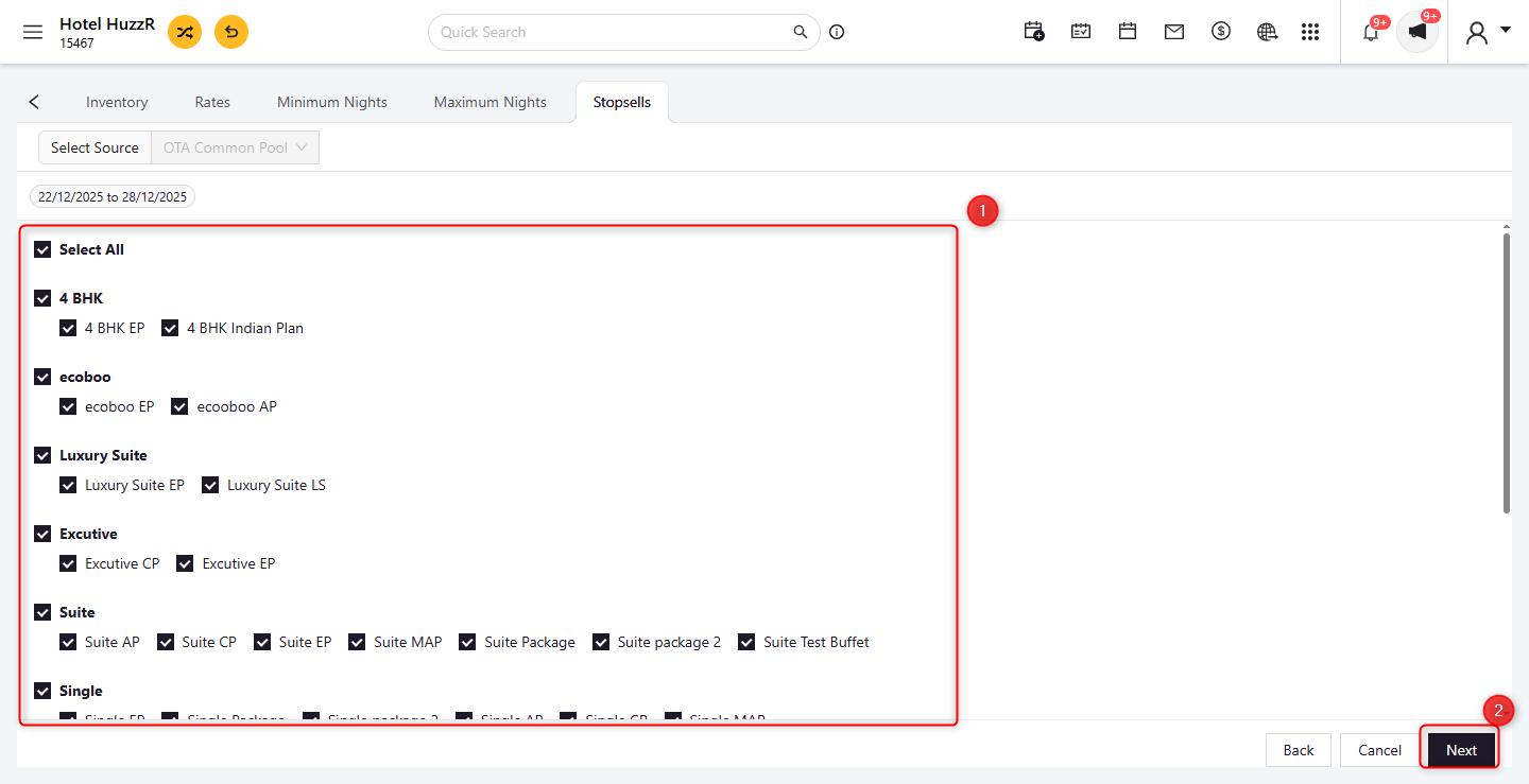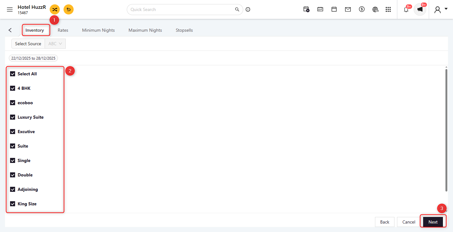 - Update Option: Select the operation you wish to perform, such as updating Rates, Inventory, Minimum Nights, or applying/removing Stop Sell.