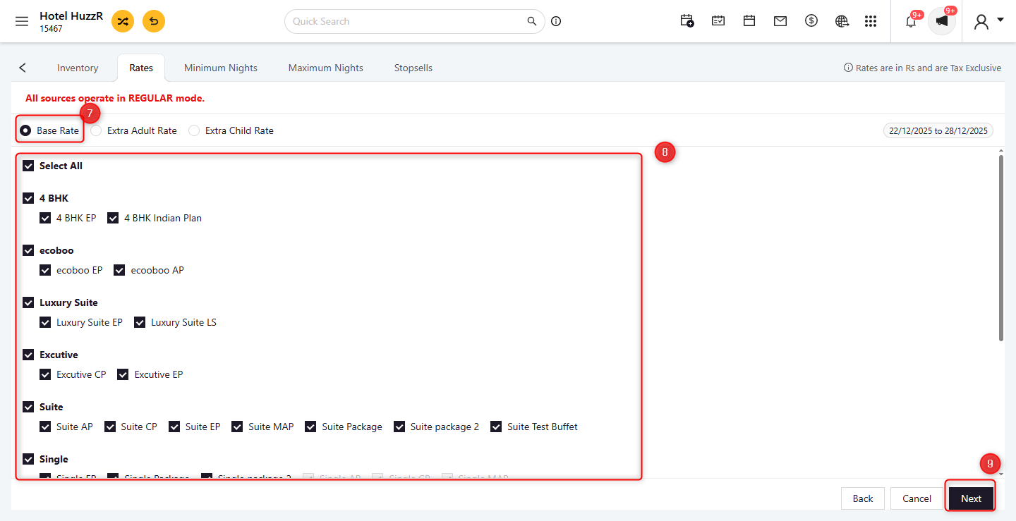- Room Type/Rate Plan: Choose the room types and rate plans you want to update. Multiple selections are allowed.