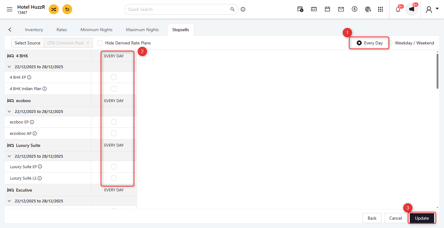 Stop Sell: Toggle the switch to apply (On) or remove (Off) a Stop Sell.Apply Updates: After entering the necessary data, click 'Update' to apply the changes. The system will process the updates, and you'll receive a notification once this is completed.