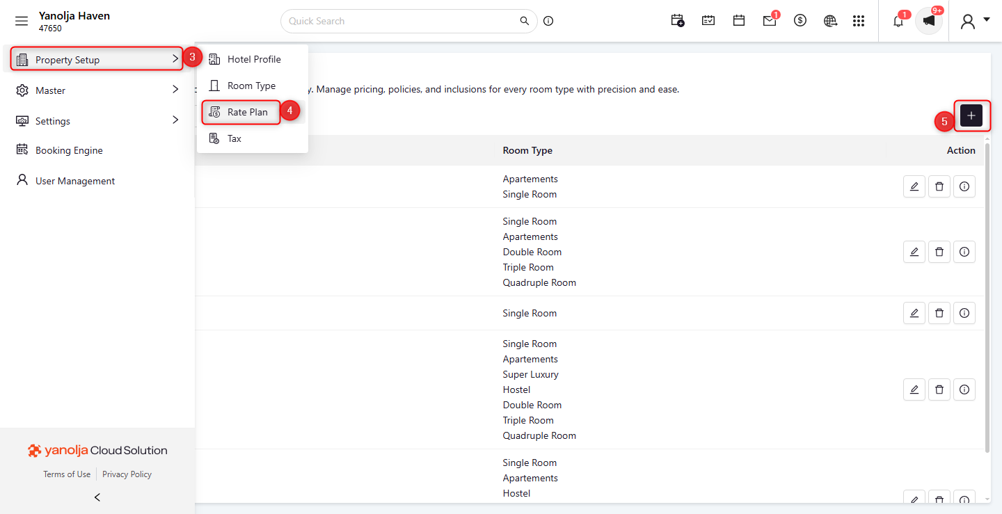 5. Click on the “+” (Add) icon to create a new Rate Plan.