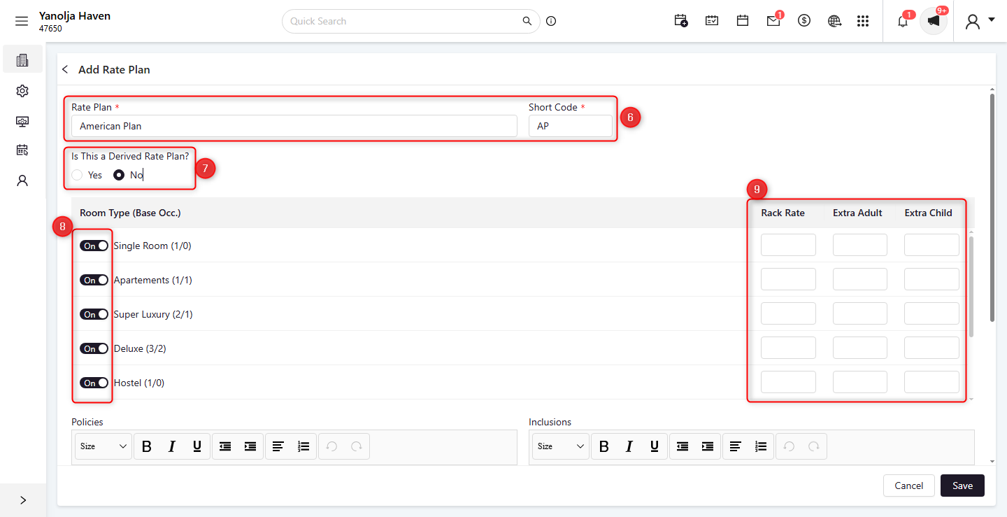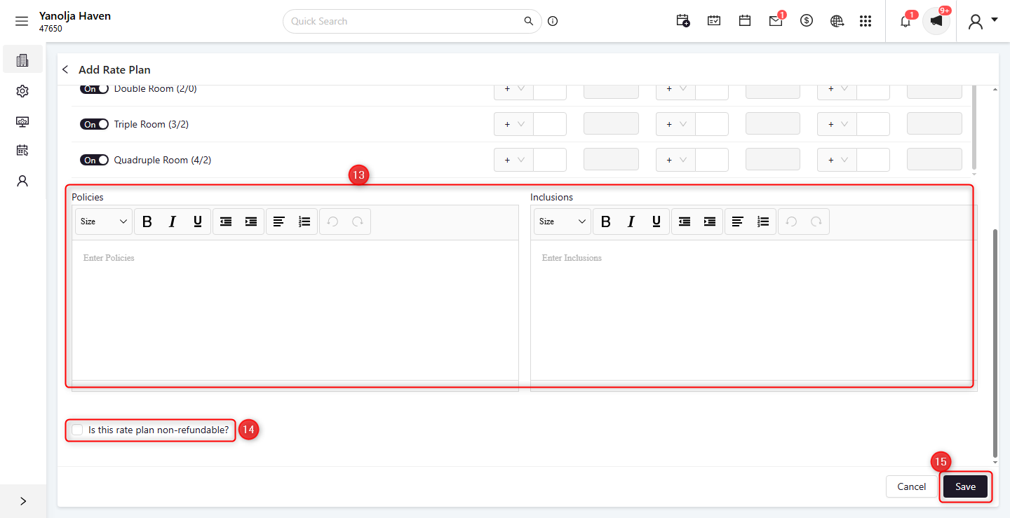 13. Add the applicable Policies (e.g., cancellation policy). Add the Inclusions for the Rate Plan.