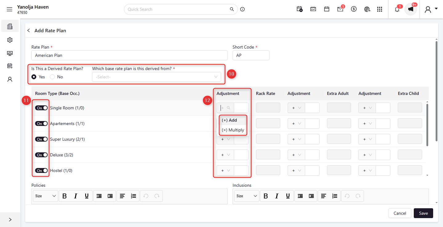12. Select the adjustment type (Add or Multiply). Enter the value by which the rate should be added to or multiplied from the base Rate Plan.
