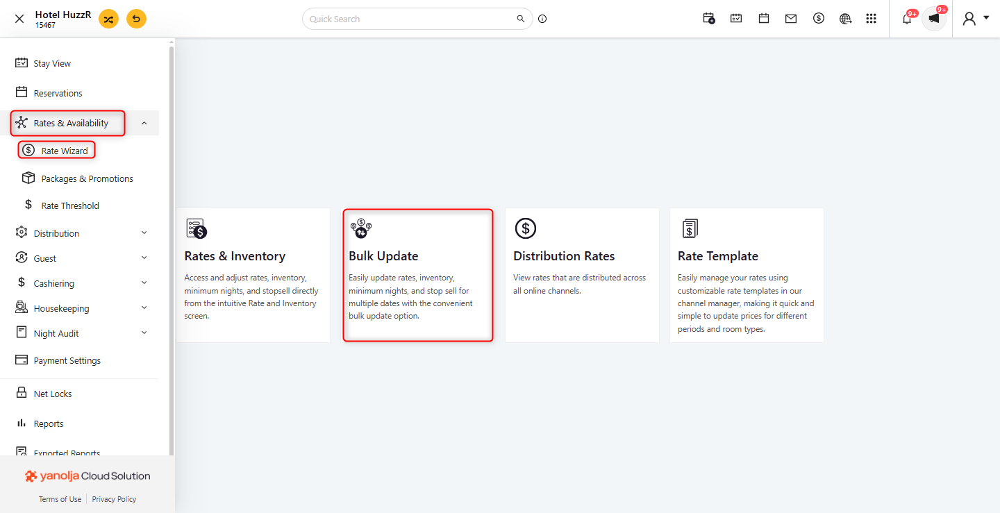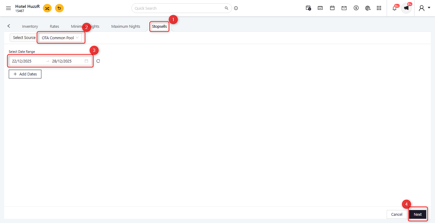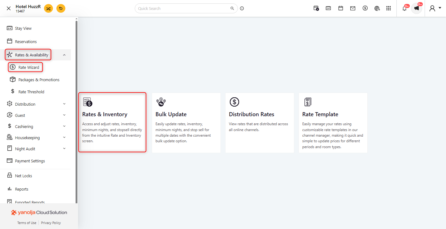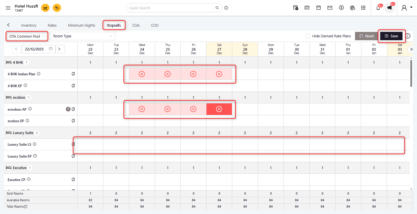 Navigate to Rate & Availability>> Rate Wizard >> Rates & Inventory >> Stop Sell.