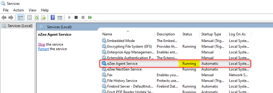 Step 1: In the Services window, scroll down to find "eZee Agent Service" in the list of services.