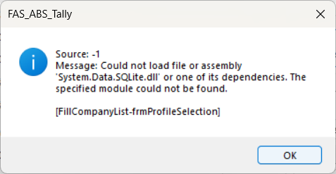 Ans: You are seeing the error message: "Could not load file or assembly 'System.Data.SQLite.dll' or one of its dependencies. The specified module could not be found." This error appears when you log in to the Integration software.