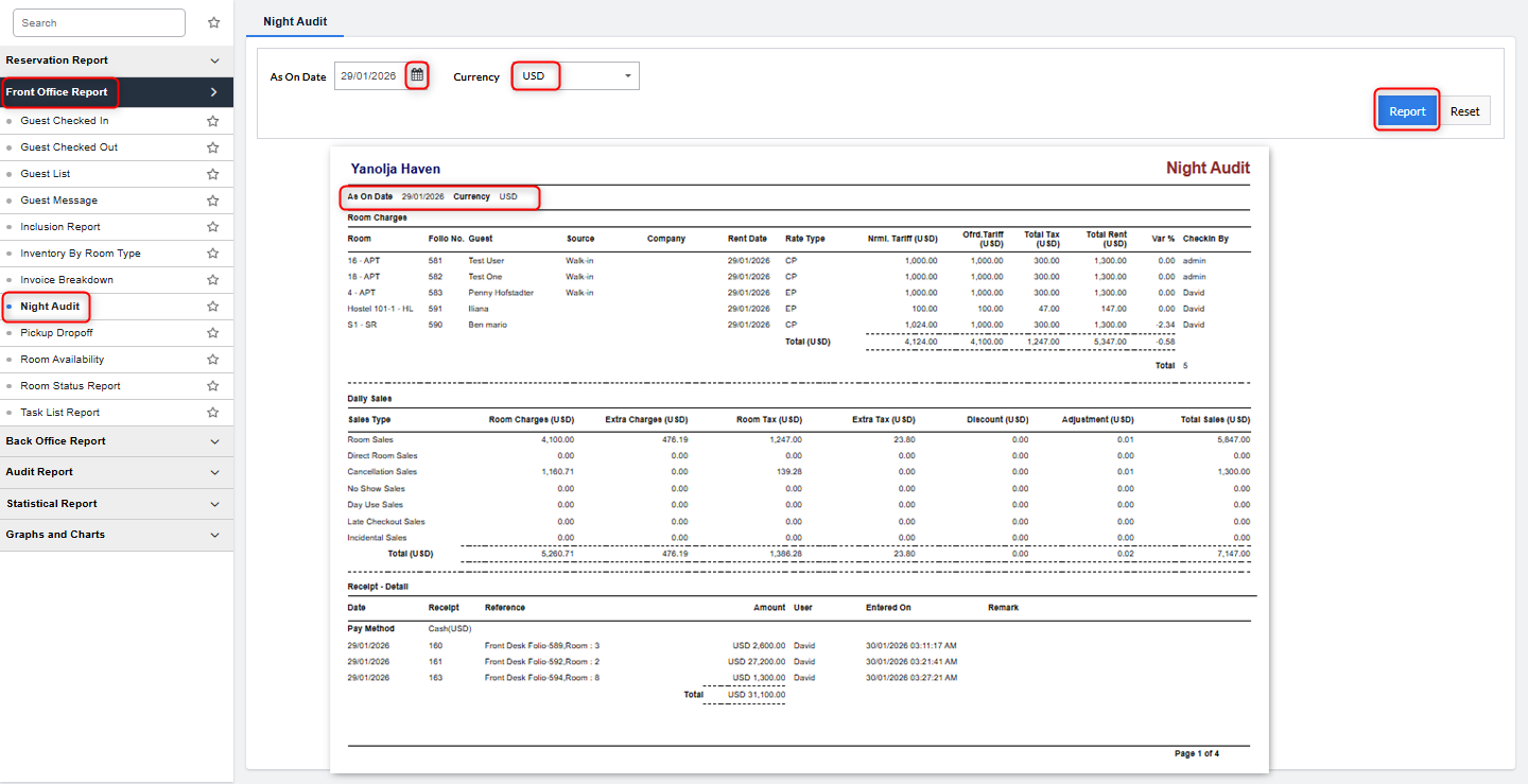 After successful completion of the Night Audit, the system generates several reports that summarize the day’s activities and transactions. Common reports include: