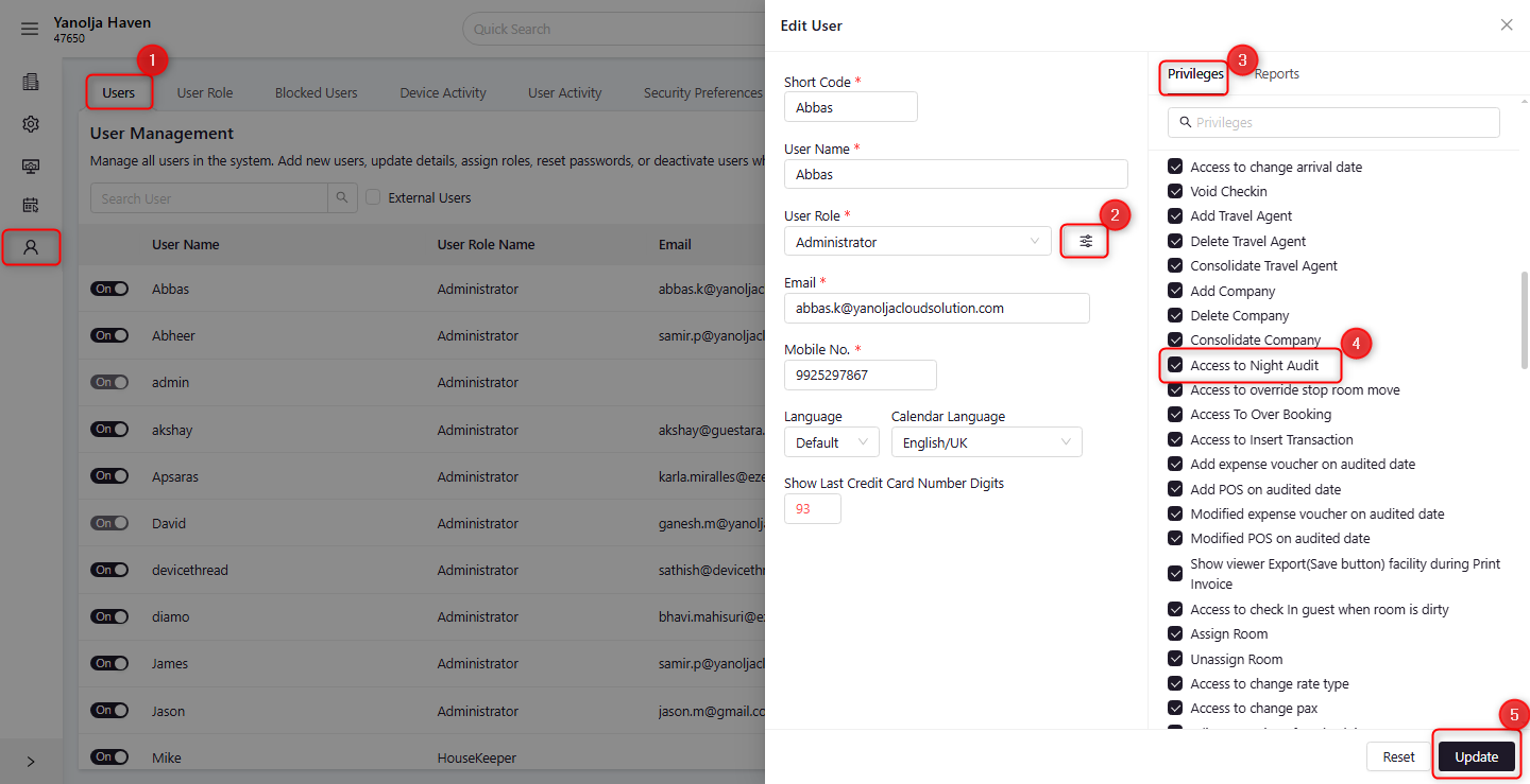 To perform the Night Audit, the user must have appropriate access rights. Access can be granted by following these steps: