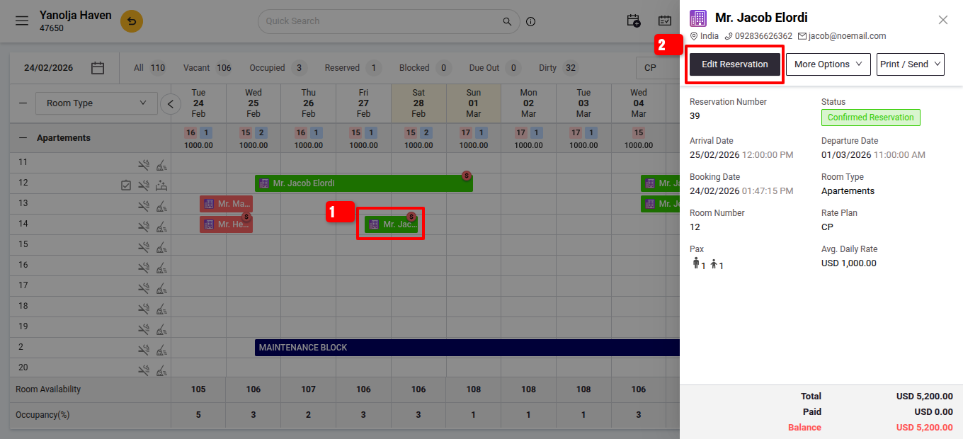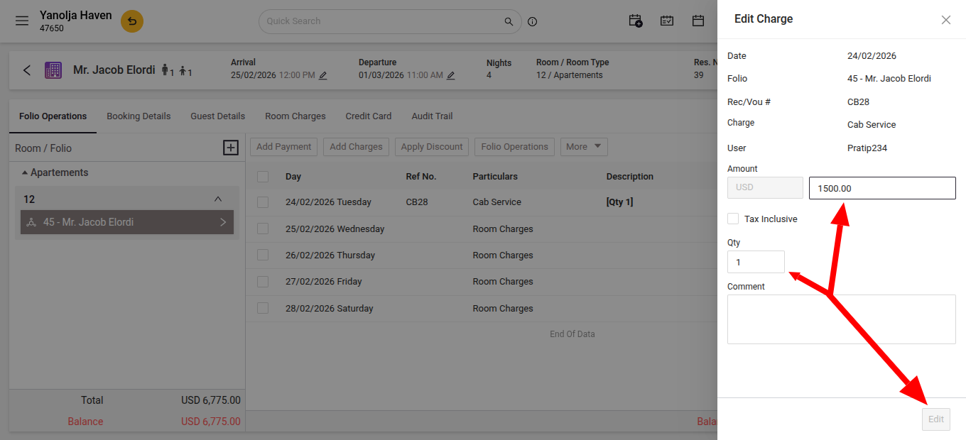 - Locate and click on the reservation associated with the extra charge you wish to edit.