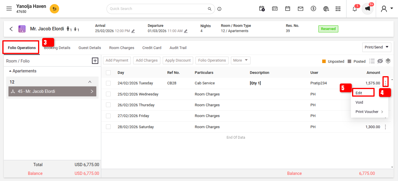 - Select the "Folio Operations" tab to view all charges which are posted to the reservation.