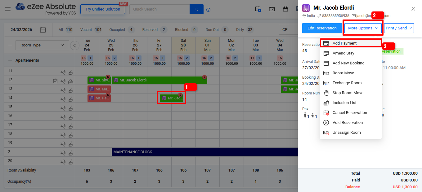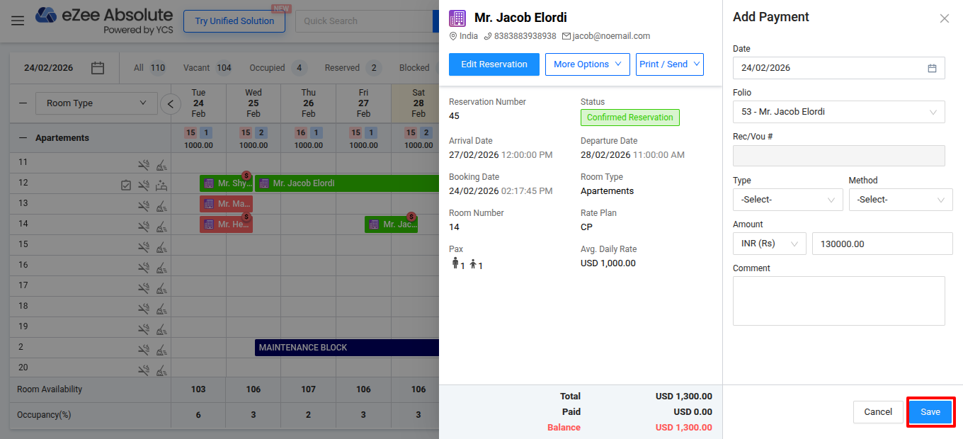 To record a guest's payment in PMS , follow these steps: