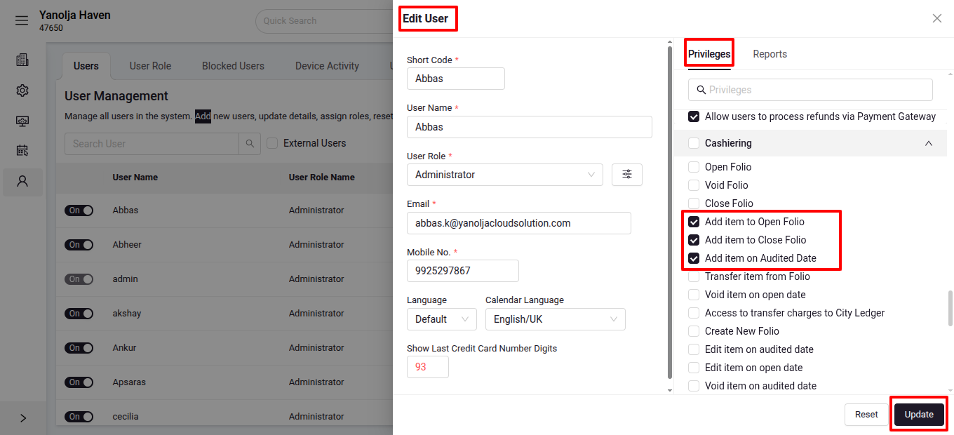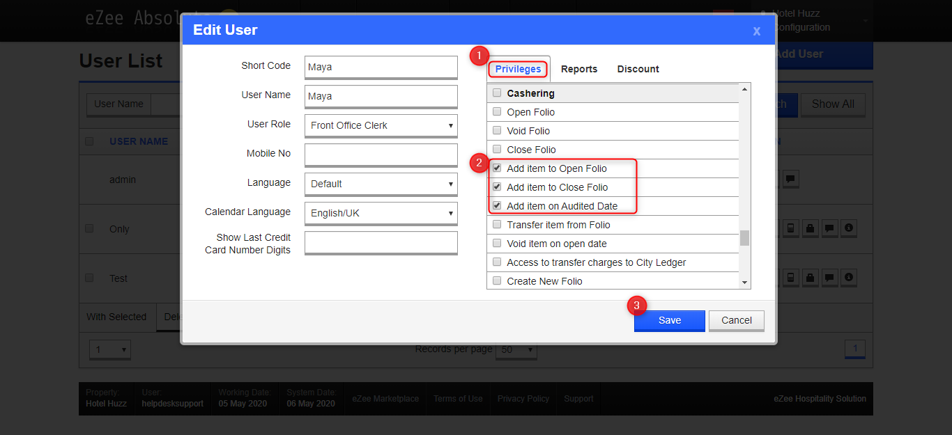 Ensure you have the necessary user privileges to add payments. If you encounter issues, verify your user has below listed permissions in eZee Absolute Configuration under User Privileges.- Add item to Open Folio