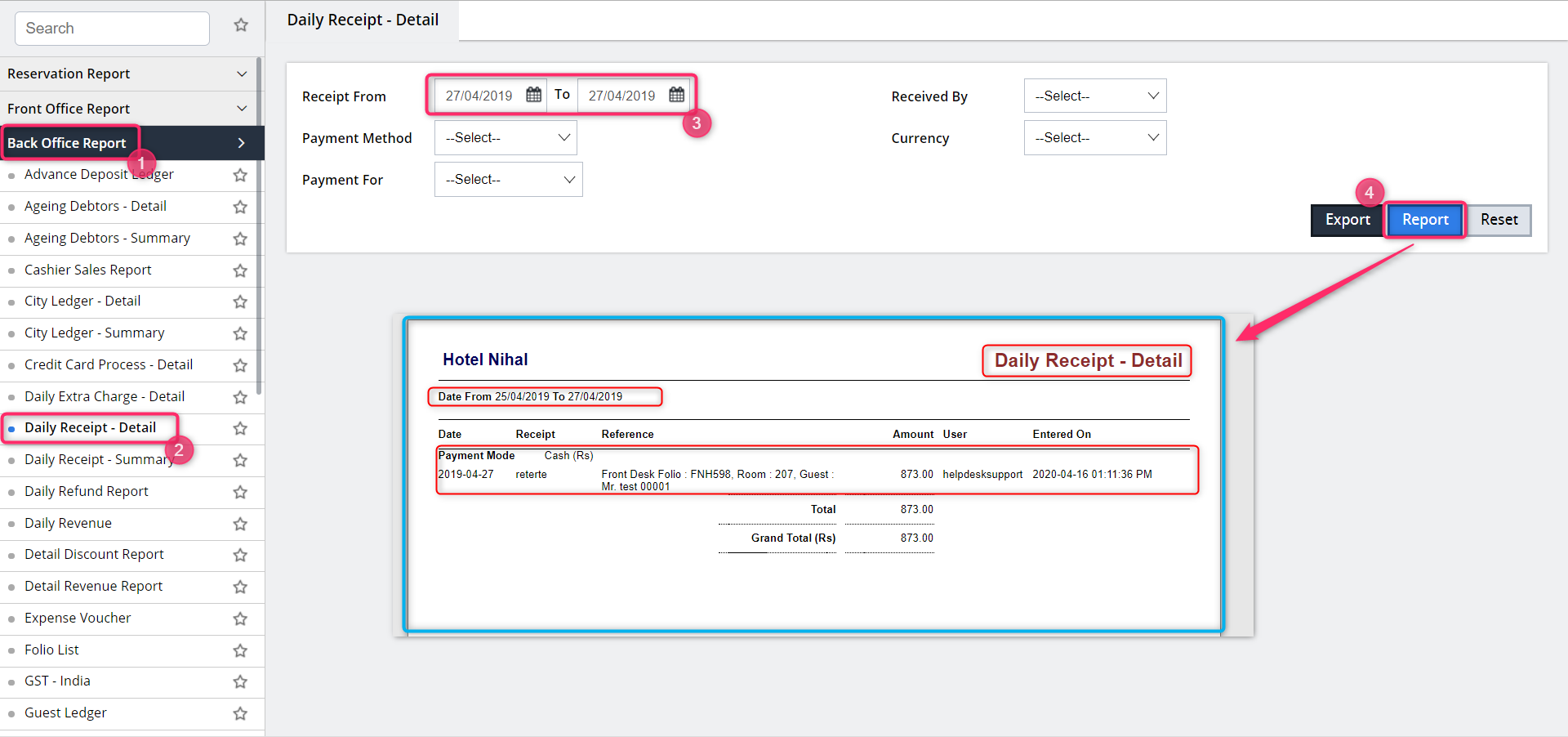 - Report: We can also see the report on the payment which we collected from the guest in the daily receipt - details report and daily receipt detail - summary.