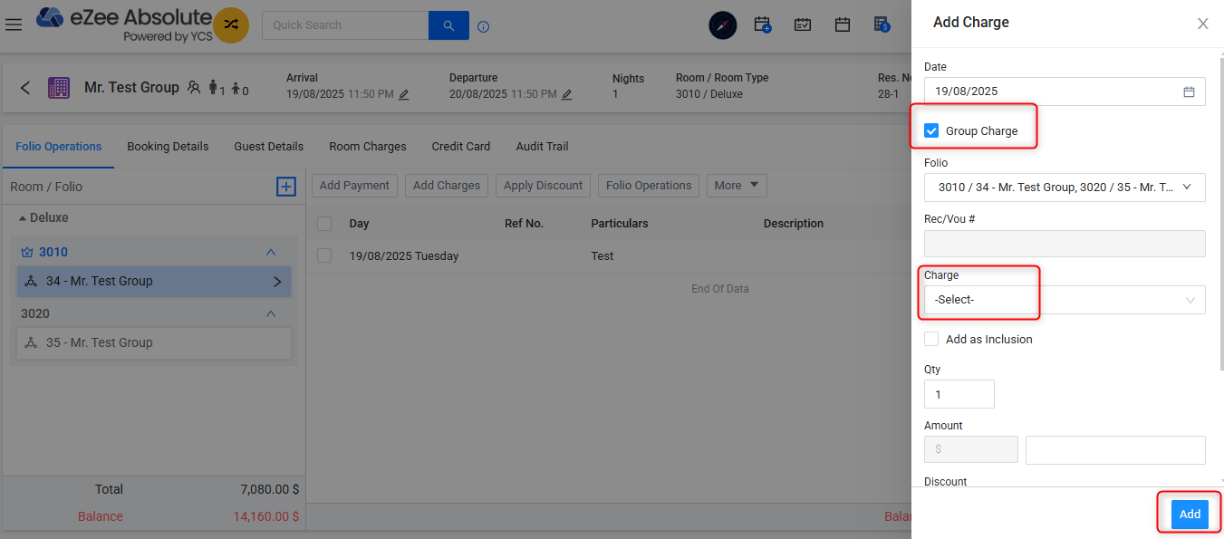 - Click Add to apply the charge.