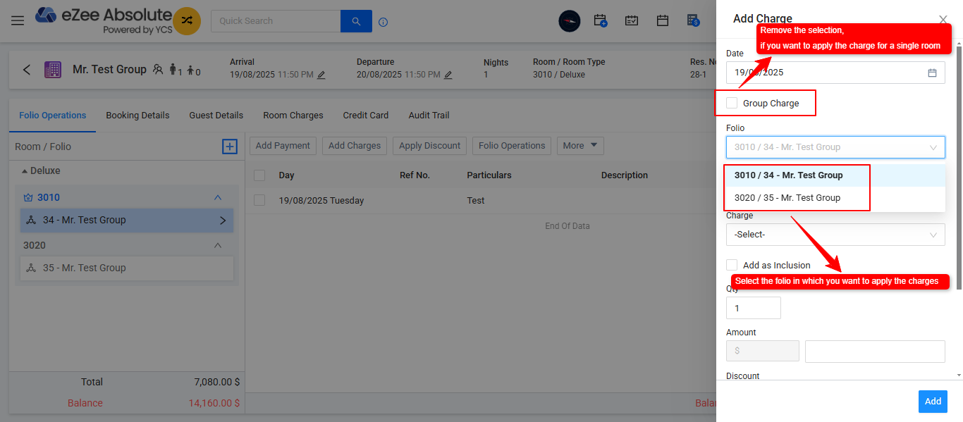 - Select the "Group Charge" option is you wish to add the chrges to the whole group or remove the selection of "Group Charge" option to apply the extra charge the individual Room.