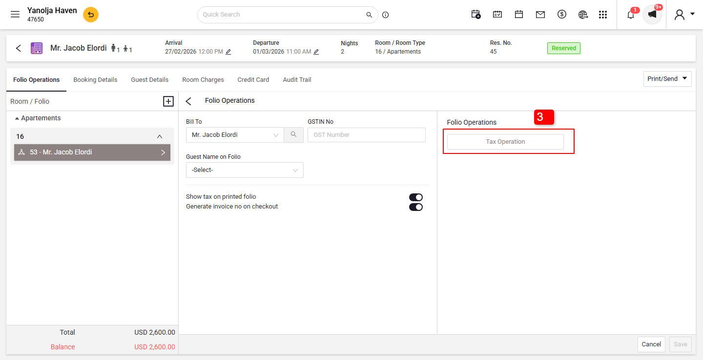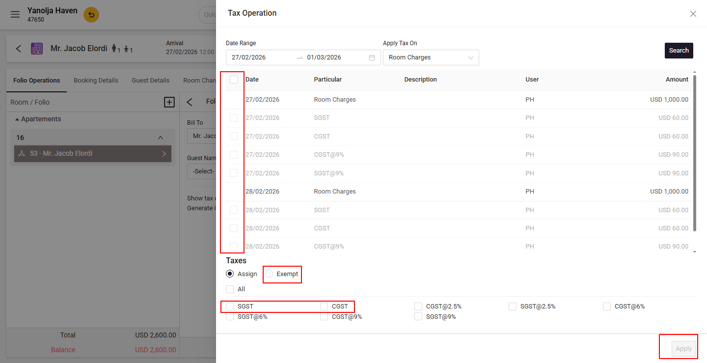 To exempt tax on a reservation in PMS, even after check-in, follow these steps: