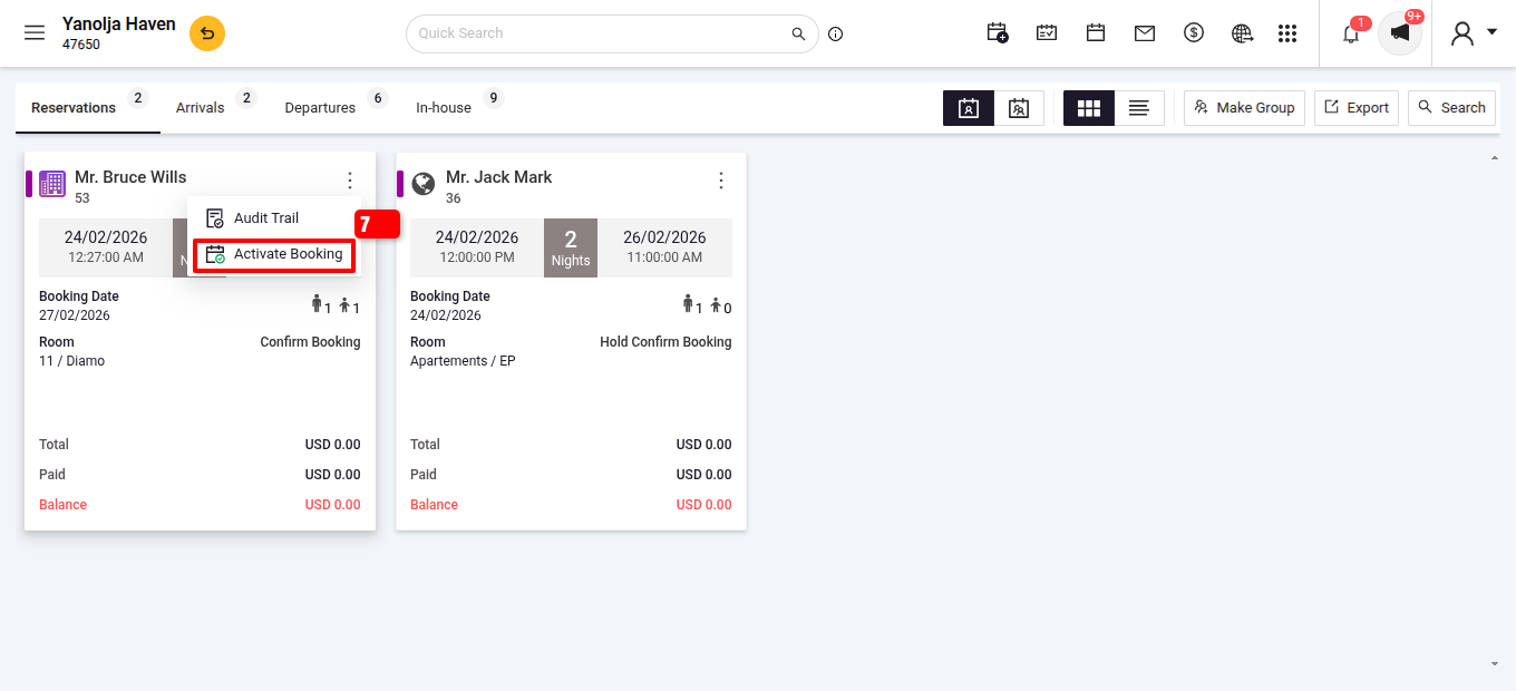 Important Note: Reactivating a booking will set its arrival date to the current working date. It is not possible to reactivate a reservation with its original past arrival date.