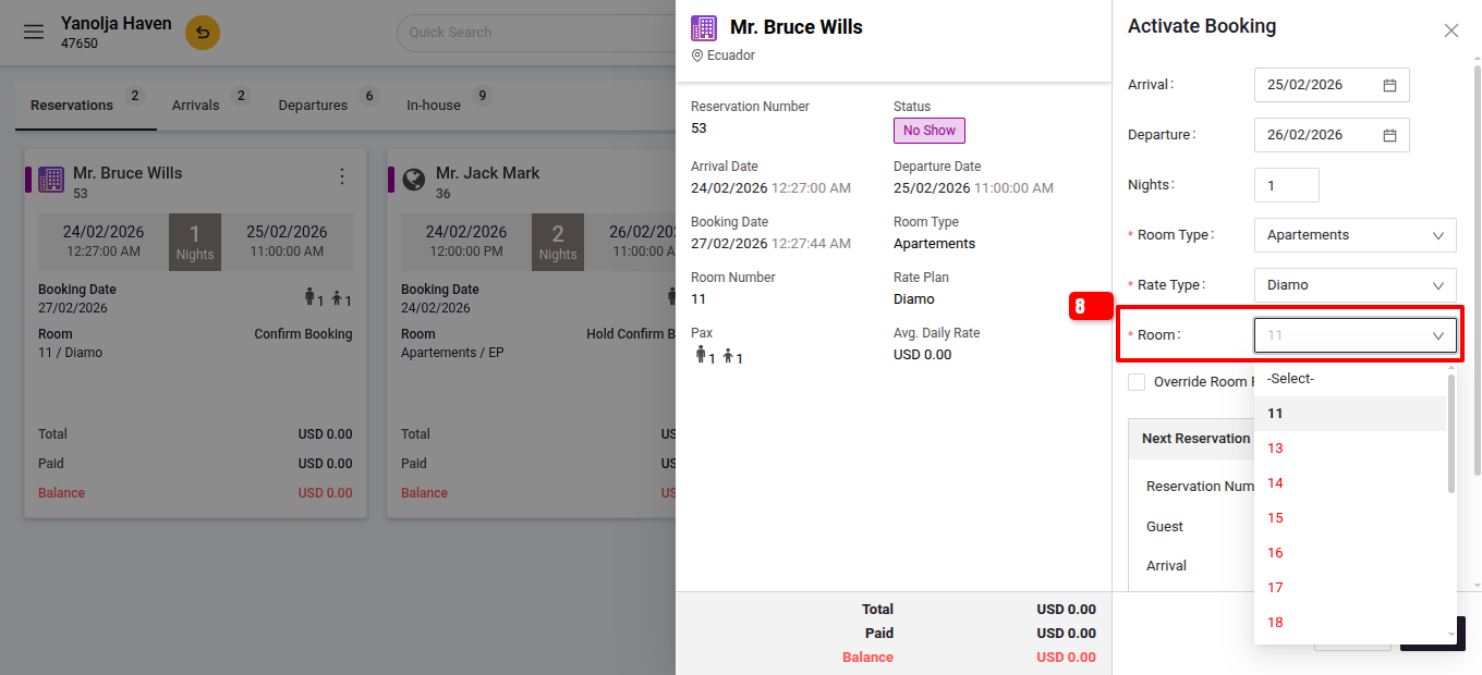 After the night audit, for any booking which was No show and you want to activate, you can use this option, after you activate the booking, it will have a new arrival the same as the current working date.