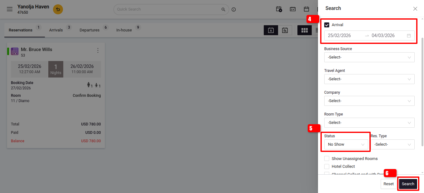 Search for the No Show Reservation:- Click on the Search option.