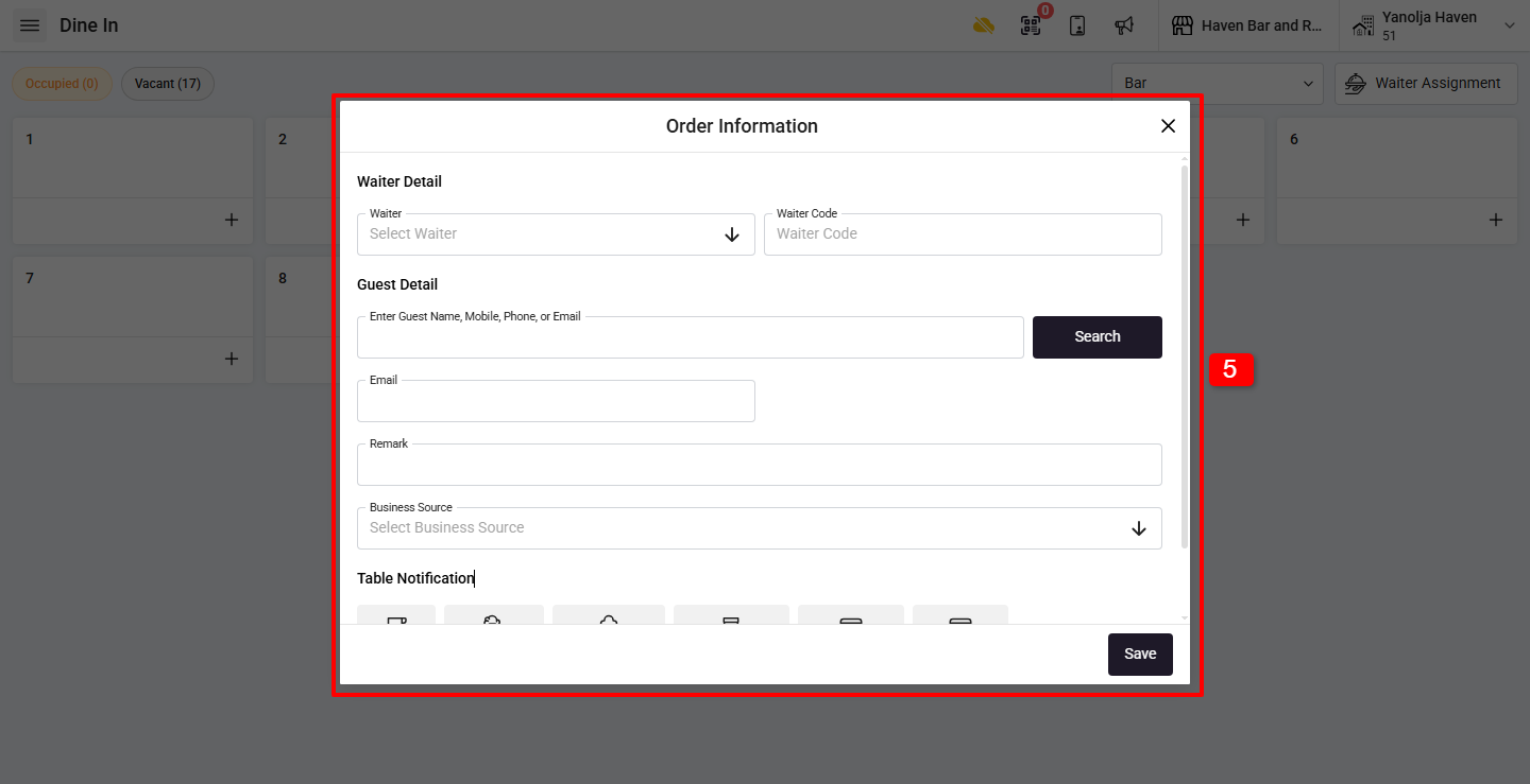 5. An Order Information window will open. Enter the required Guest Details. Proceed to the ordering screen, by click on the “Save” button.