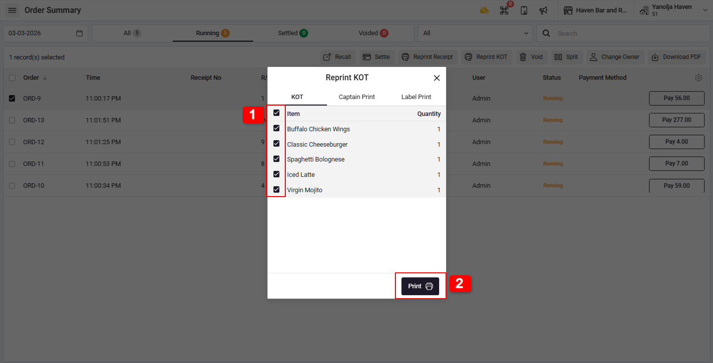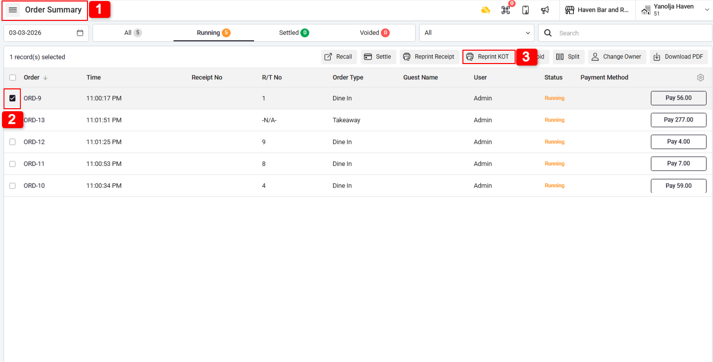 Reprinting a KOT (Kitchen Order Ticket)