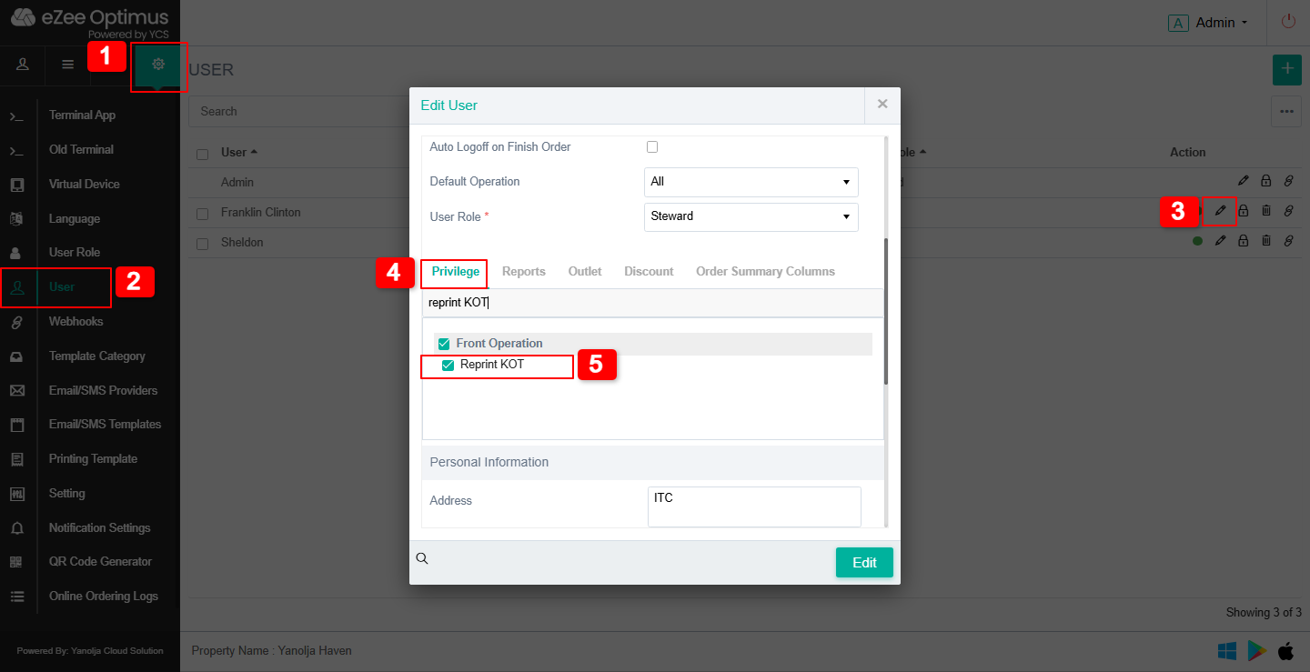To reprint a KOT, the user must have the "Reprint KOT" permission enabled.