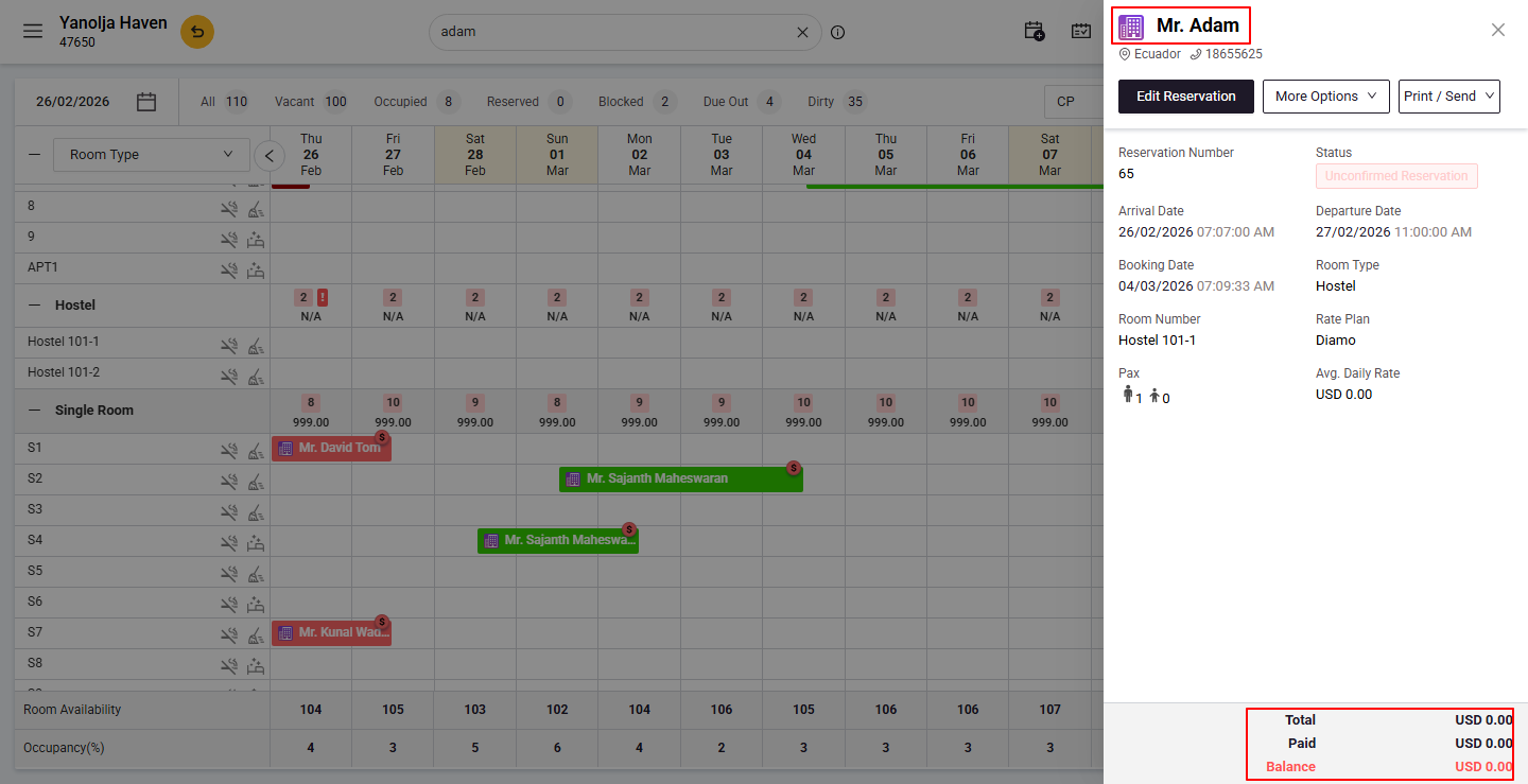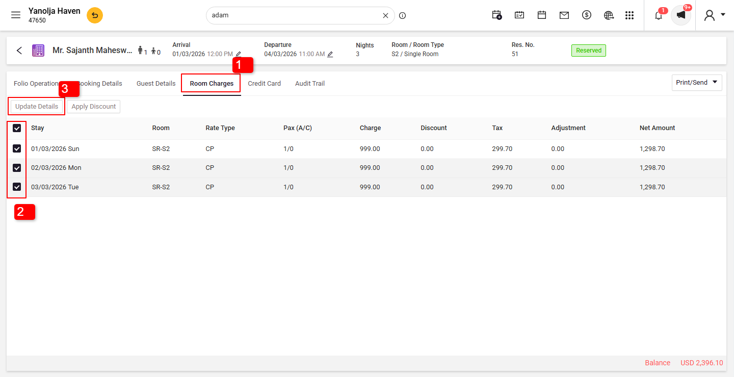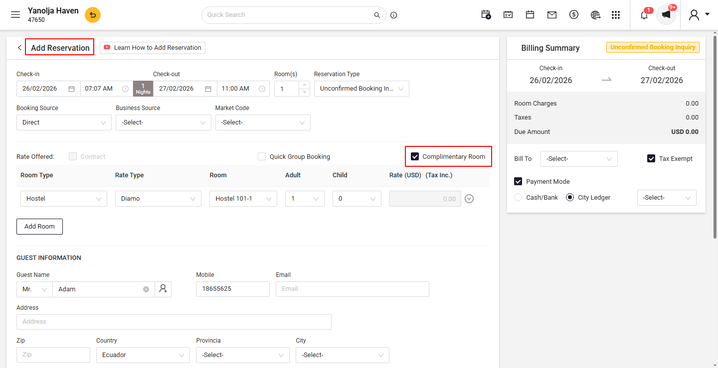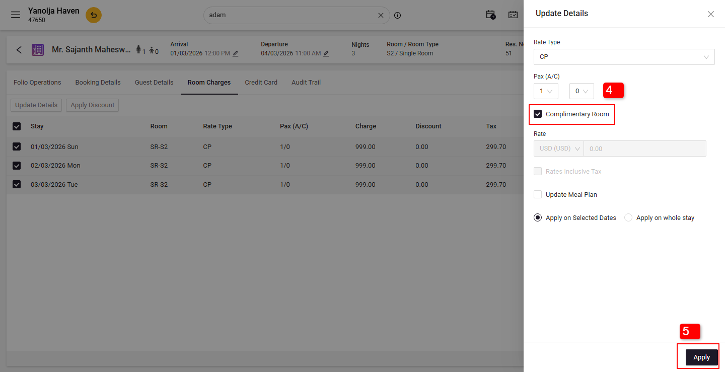 - Open the reservation to confirm that the room charges are set to zero.