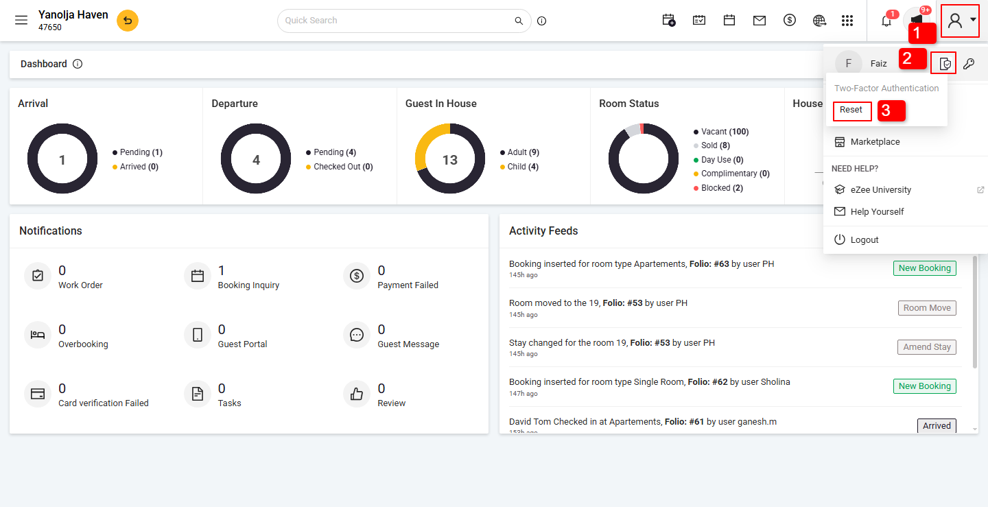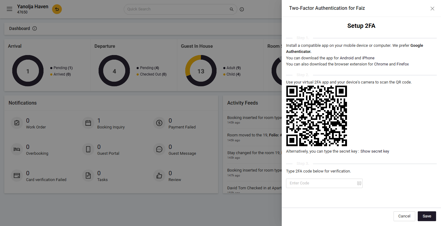 - During the next login, after entering your username, password, and hotel code, you will be prompted to enter the 6-digit code from your authenticator app.