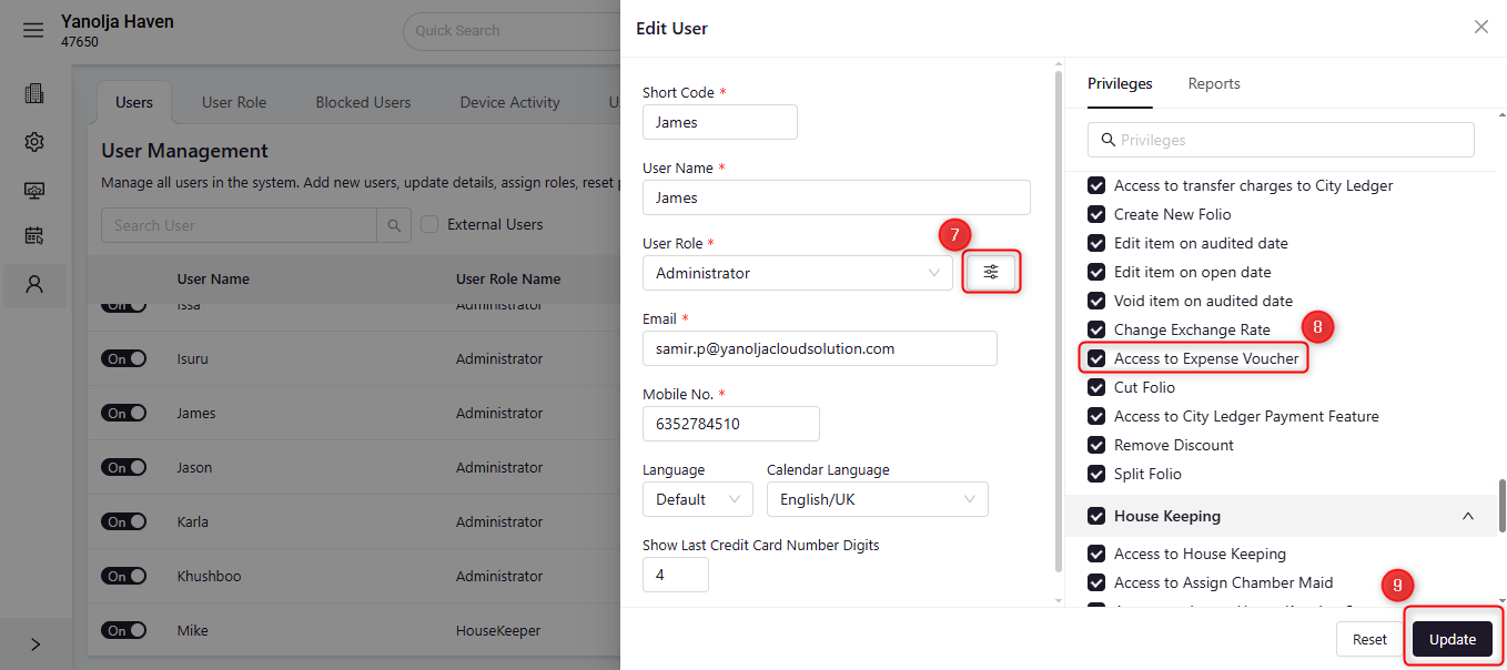 Under Front Office Privileges, enable the Access to Expense Voucher privilege.