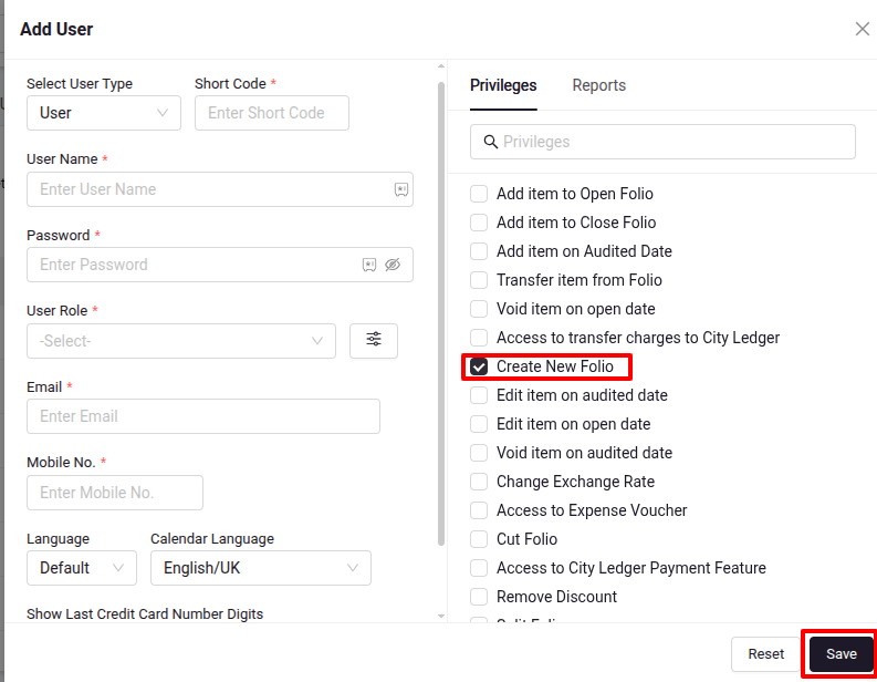 User Privileges: Go to configuration >> User Management >> Edit user >> Privileges >> Cashering >> Create new Folio.