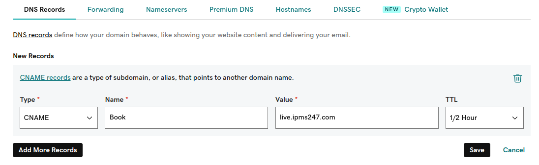 | Name | book (you can use any subdomain like booking, reservations, etc.) |