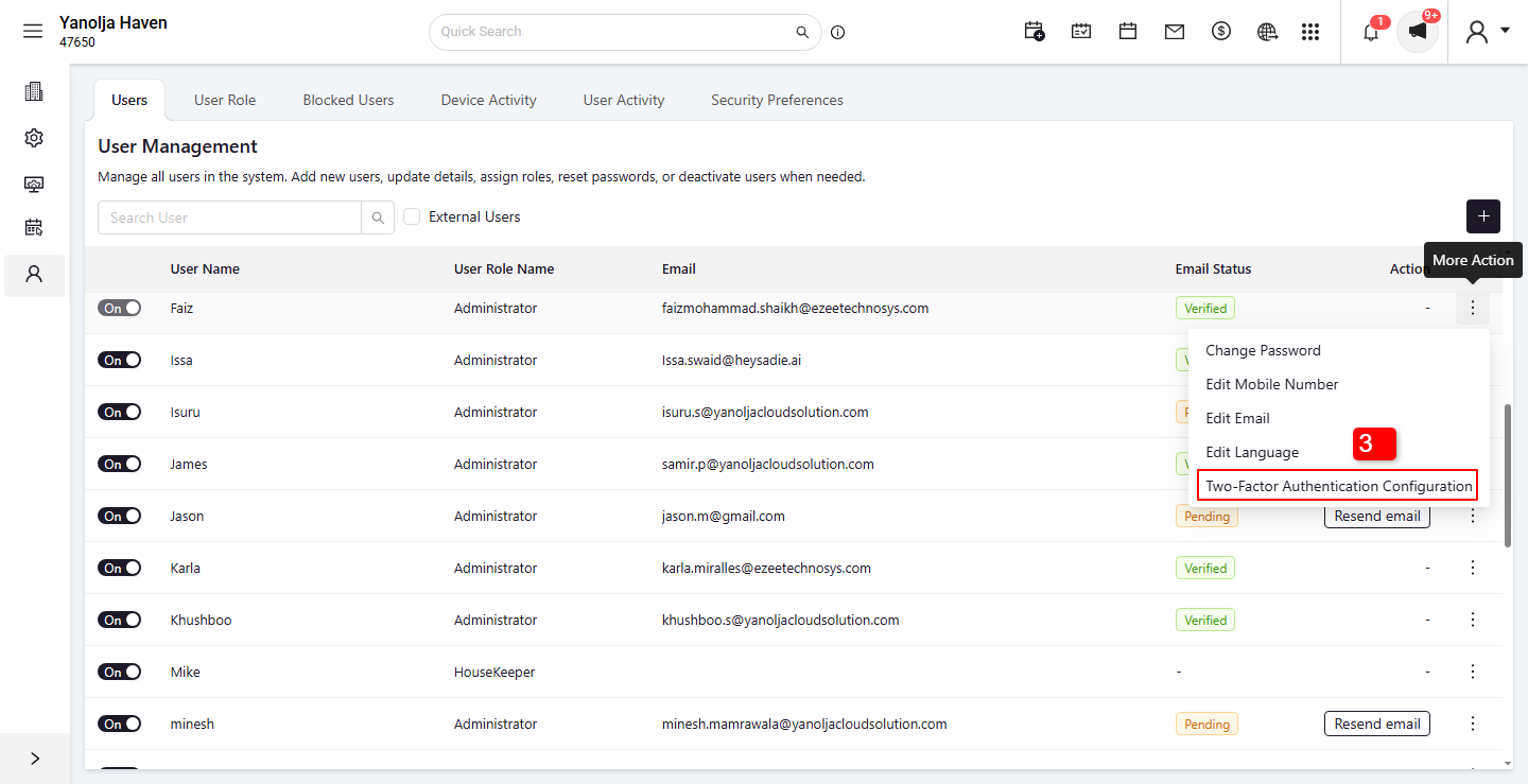 3. Click on the three dots and select Two-Factor Authentication Configuration.