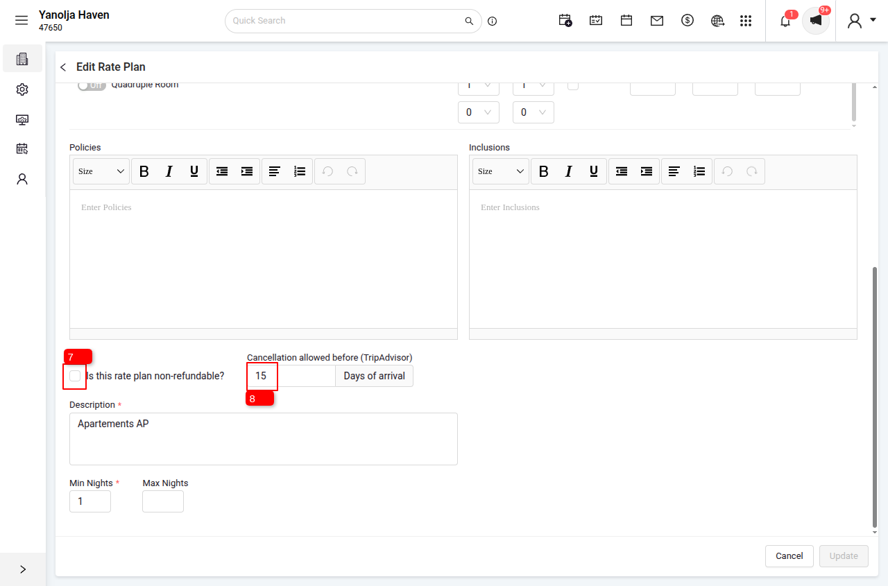 To enable Tripadvisor connectivity, a Cancellation Policy must be added to the system. Any Rate Plan displayed on the Booking Engine must contain a specific cancellation policy (defined by the number of days). You must add the "Number of Days" a guest can cancel before arrival for all Refundable Rate Plans.
