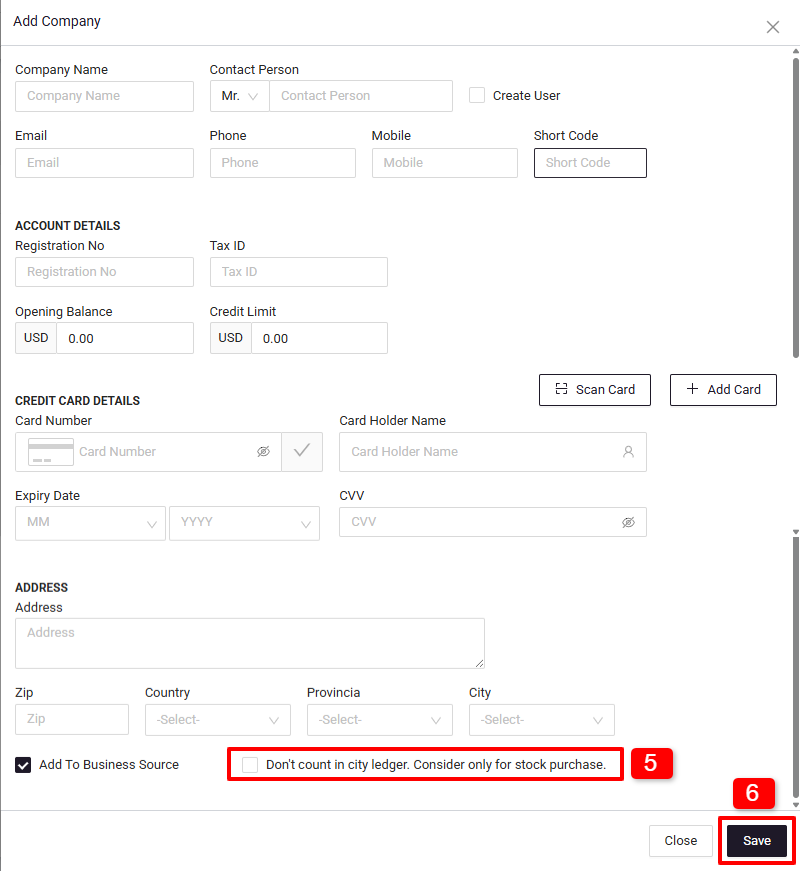- If the company you're adding is a vendor and you prefer not to include them in the city ledger or company list, there's an option labeled 'Don't count in city ledger, Consider only for stock purchase'.