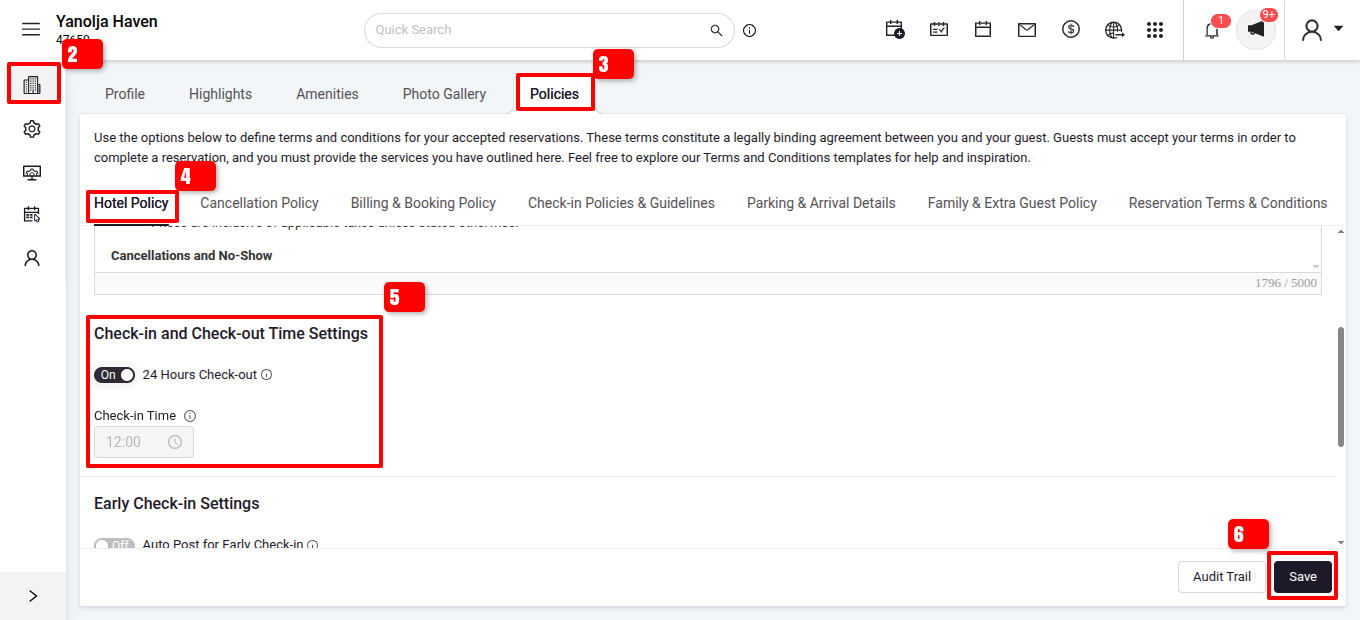 Path: Login into PMS >>Go to Configuration >> Property Setup >> Policies >>Hotel Policies>> Check In/Reservation Settings >> Check In and Check Out time settings >> Set value >> Save.