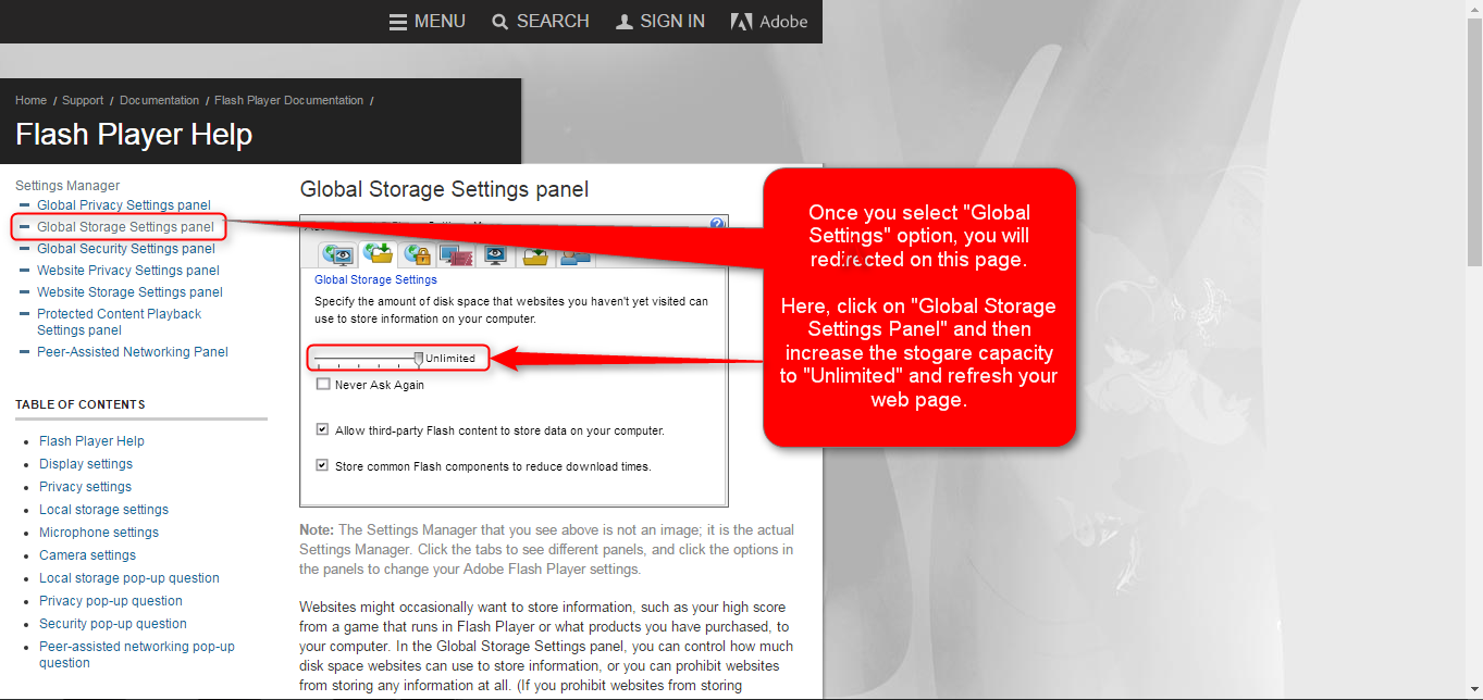 5. It will open Flash Player Help Page. Please select Global Storage Settings Panel.