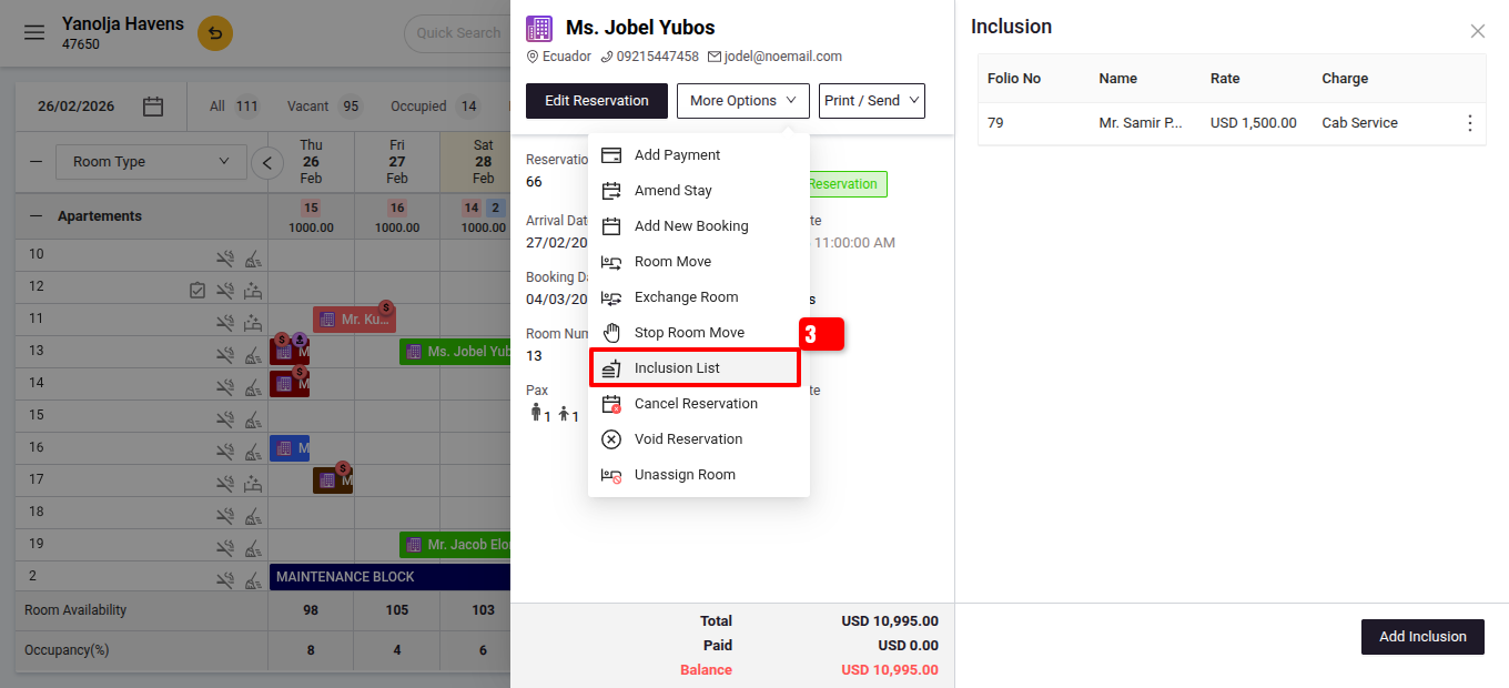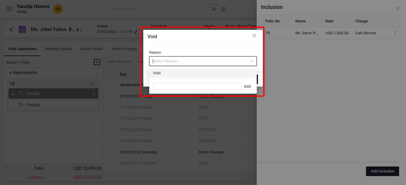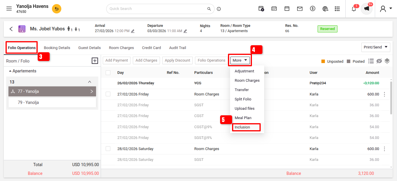 This feature is particularly useful for adding recurring charges, such as daily breakfast fees, parking, or service charges. It eliminates the need for manual entries, ensuring accurate and efficient billing for guests’ additional services or expenses. You can apply inclusions during check-in, checkout, or on a custom date, streamlining the process and enhancing operational efficiency.