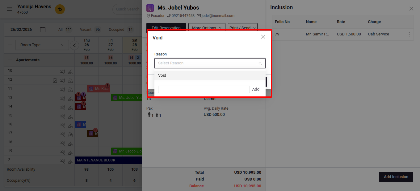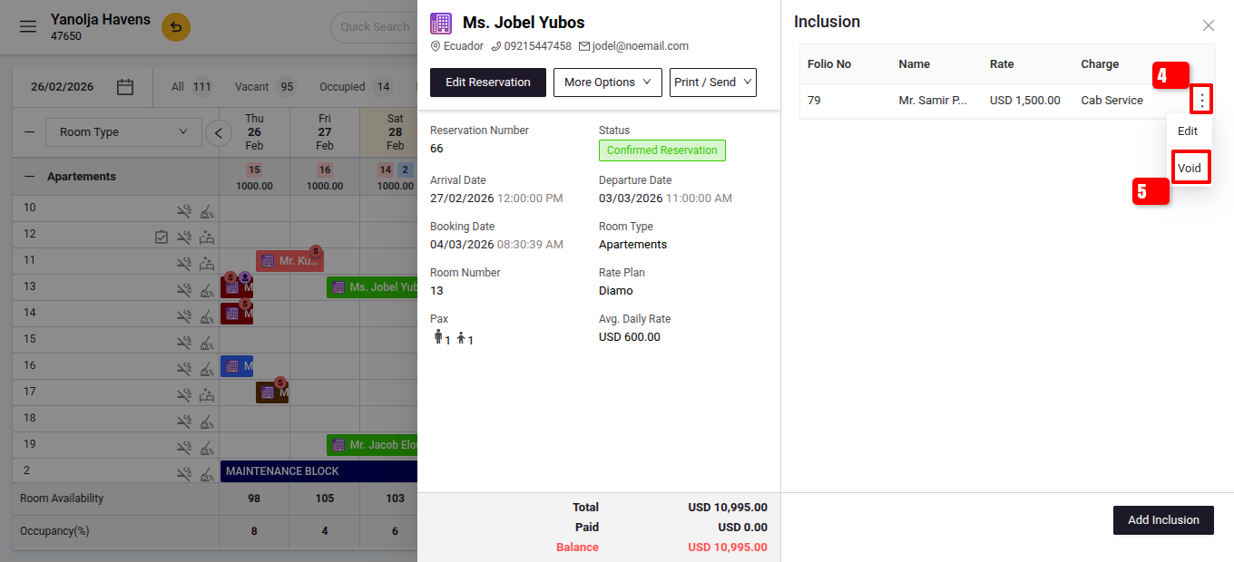 - Click on the reservation where you want to void an inclusion.