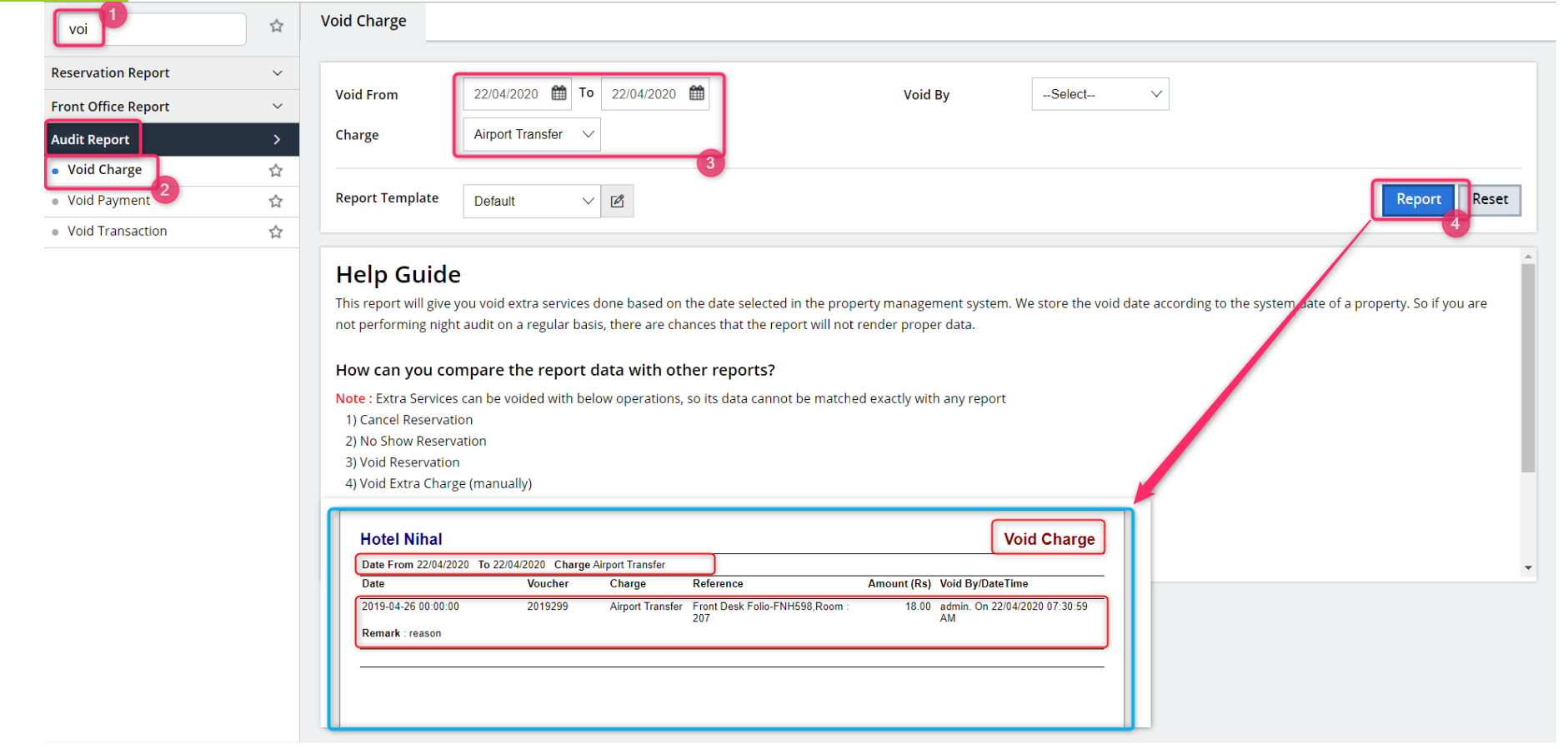 All voided inclusions are recorded in the Void Charge Report. Since inclusions function similarly to extra charges, they appear as voided extra charges in the report for accurate tracking and auditing.
