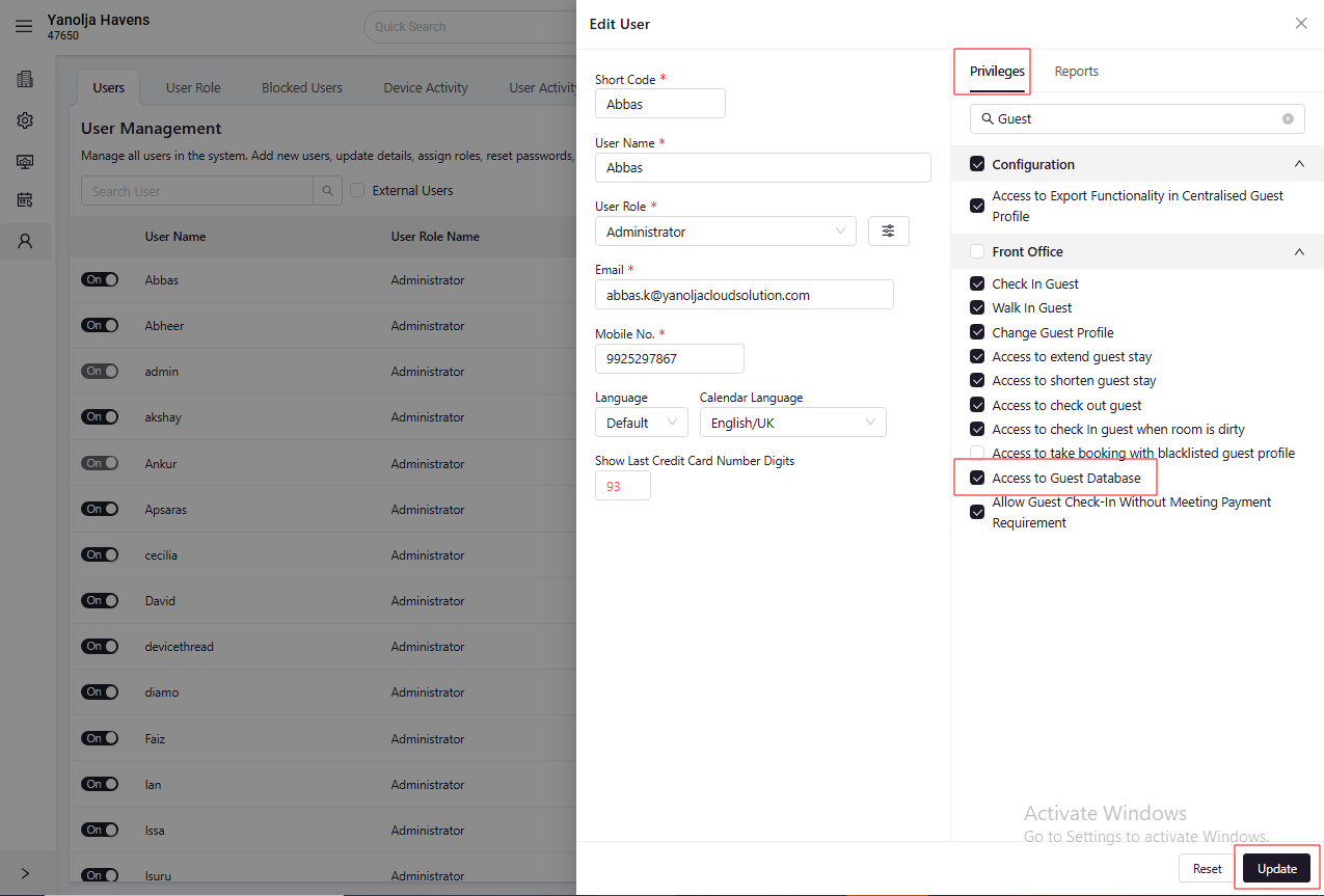 - Under Privileges, enable Front Office > Access to Guest Database.